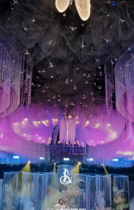 Để hoàn thiện công trình này, đội ngũ thi công đã phải làm việc liên tục trong gần 2 ngày, từ dựng khung, trang trí đến sắp xếp từng chi tiết nhỏ, nhằm mang đến một không gian cưới chỉn chu, xa hoa và khác biệt.
