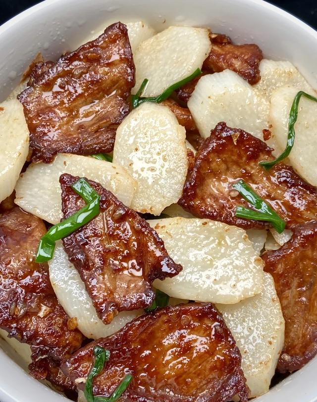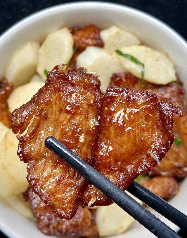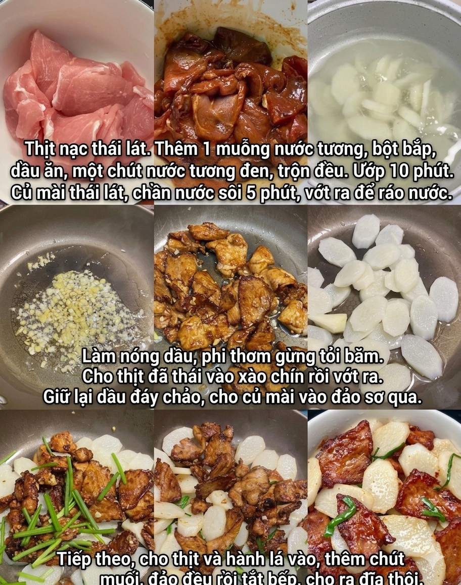 Trong khi đó, món củ mài thái lát xào thịt trông có vẻ đơn giản, nhưng xào củ mài đến khi trắng giòn thì không hề dễ.