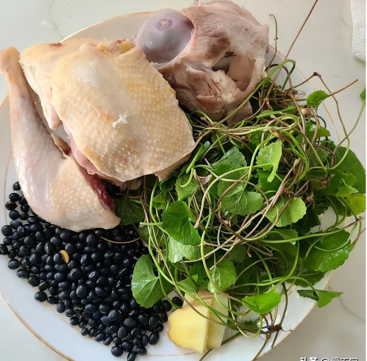Thành phần nguyên liệu: Một nắm rau má, xương heo, một miếng thịt gà, một nắm đậu đen, vài lát gừng.