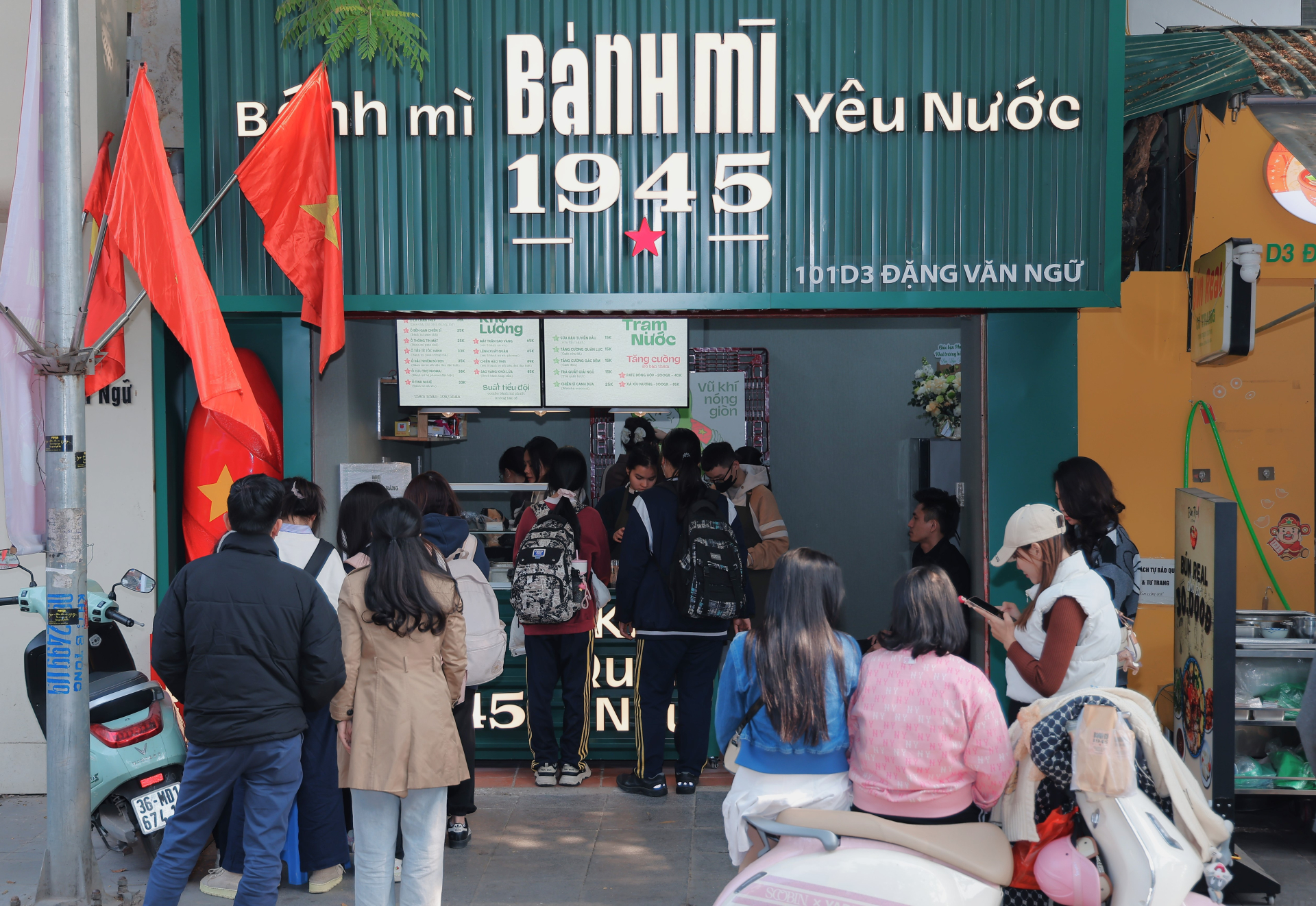 | Trên con phố Đặng Văn Ngữ vốn nổi tiếng là "thiên đường" quà vặt của giới trẻ, những ngày gần đây, tiệm bánh nhỏ mang tên Bami 1945 (số 101 D3) bỗng trở thành tâm điểm thu hút sự chú ý. Không phải bởi những biển quảng cáo hào nhoáng, mà bởi một sắc đỏ kiêu hãnh hiện diện ngay trên kệ bánh. |