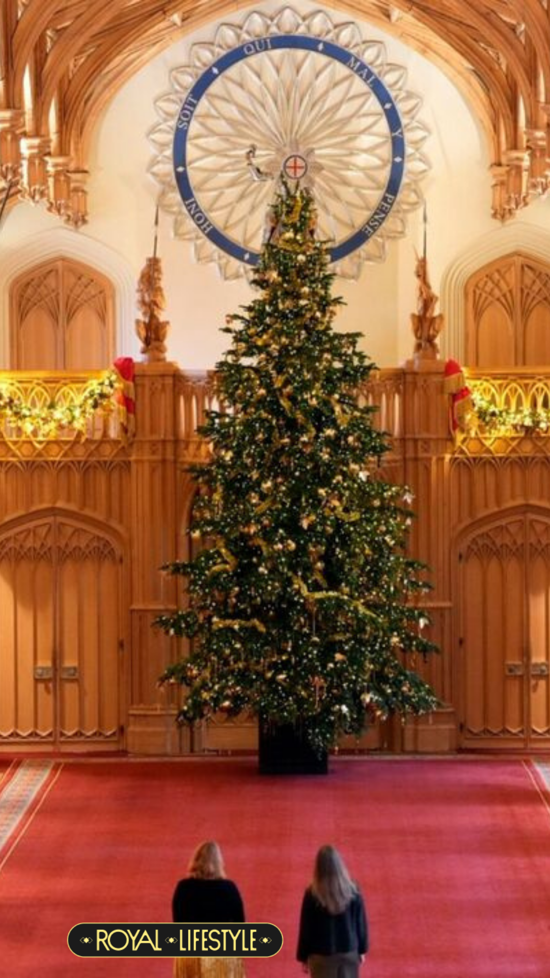 Tâm điểm năm nay là cây thông Nordmann Fir khổng lồ được dựng trong St George’s Hall – phòng lớn nhất của lâu đài Windsor. Cây được chọn từ Windsor Great Park, khu rừng rộng ngay cạnh lâu đài, nên vừa mang tính bản địa, vừa rất “đúng mùa”.
