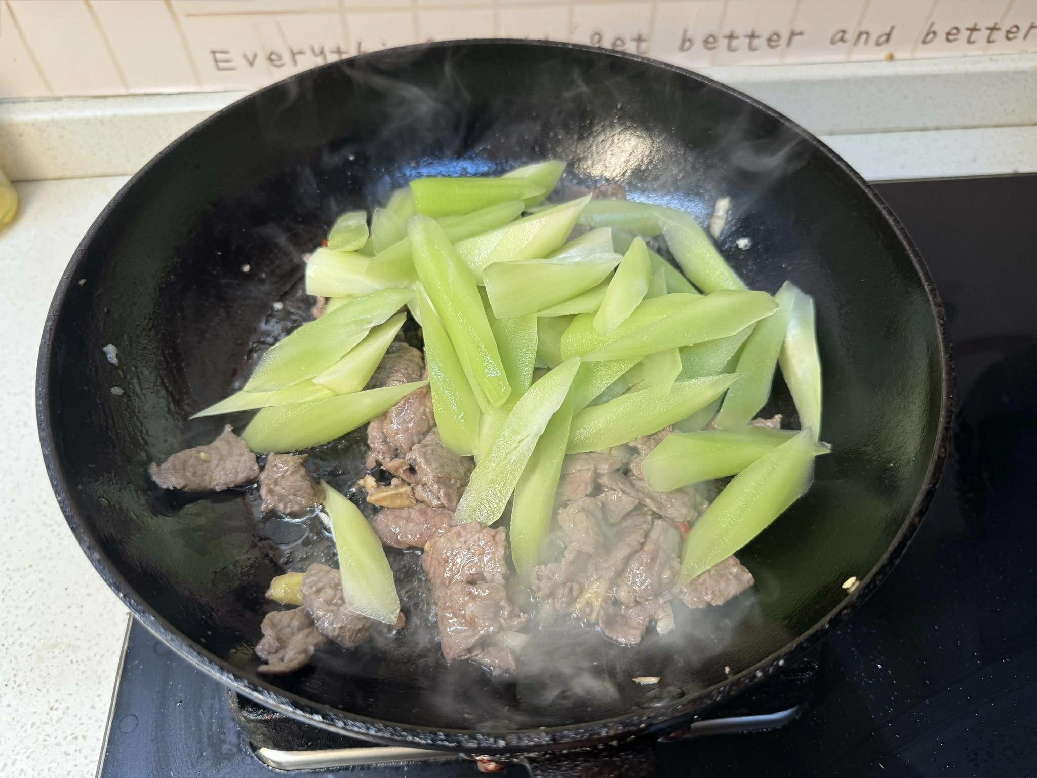 Bước 1: Bóc bỏ lớp vỏ cứng của rau diếp ngồng sau đó rửa sạch rồi thái lát mỏng hoặc cắt thành miếng nhỏ. Rửa sạch thịt bò rồi dùng khăn bếp thấm khô nước. Thái thịt bò thành các lát mỏng, cho vào bát rồi thêm một chút muối, tiêu trắng, nước tương và dầu hào. Trộn đều, sau đó thêm một thìa dầu ăn để giữ độ ẩm cho thịt bò. Trộn đều lần nữa và để sang một bên.