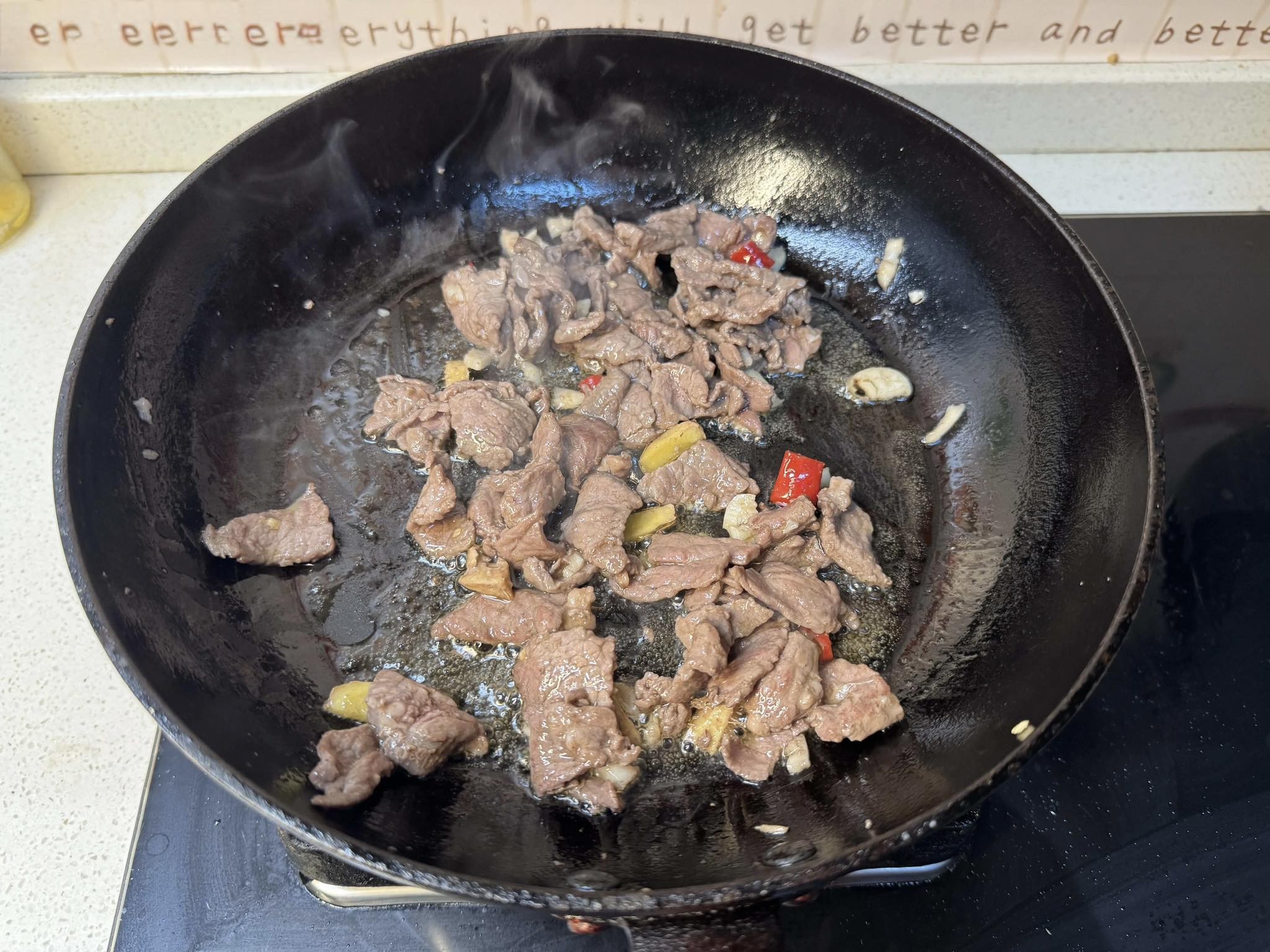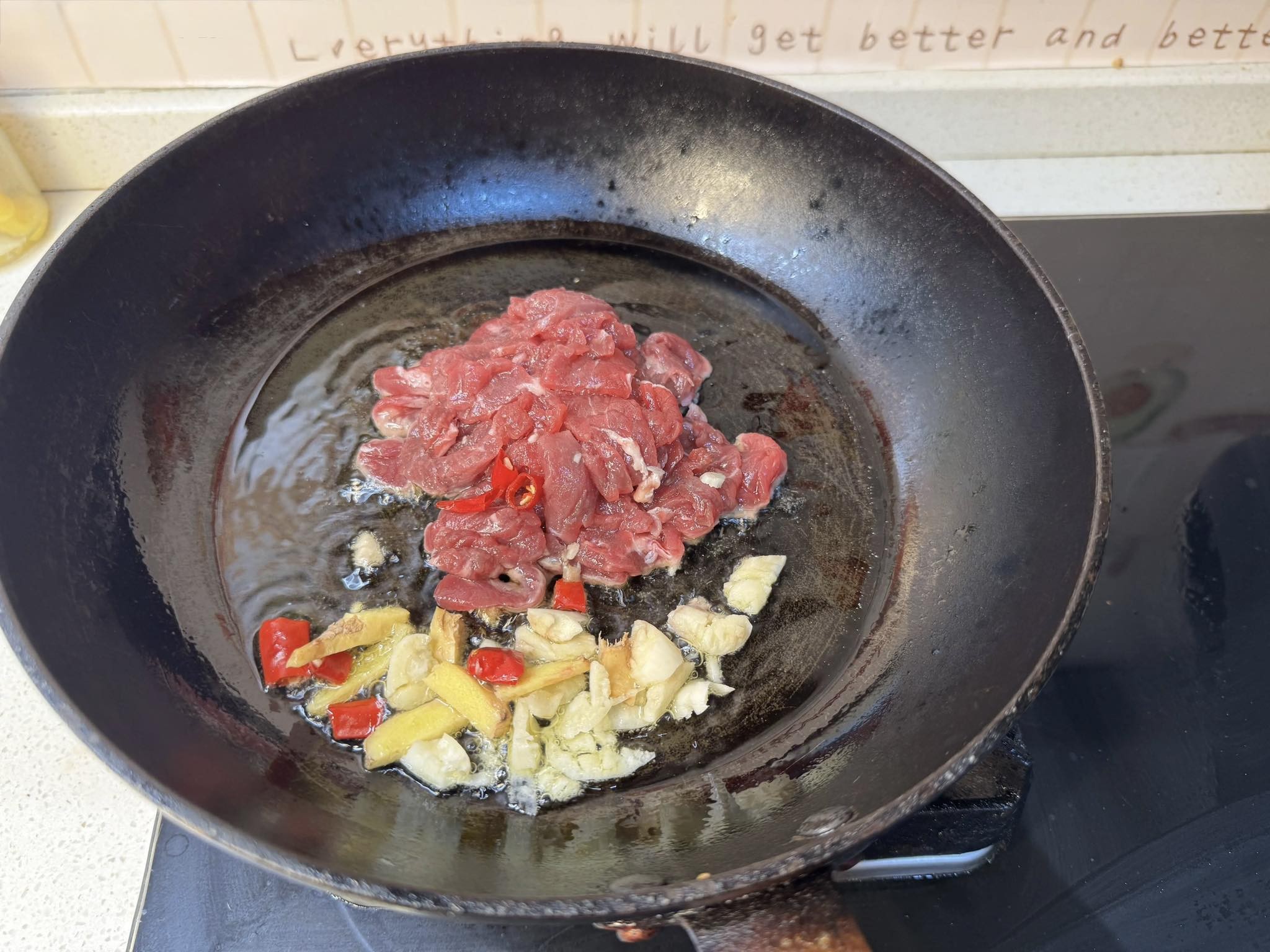Bước 2: Làm nóng dầu trong chảo, cho gừng, tỏi, ớt vào xào thơm. Tiếp theo cho thịt bò đã ướp vào xào. Xào thịt bò cho đến khi hơi vàng và chuyển màu hoàn toàn. Thịt thăn bò chín rất nhanh và có kết cấu mềm, vì vậy không cần xào quá lâu.