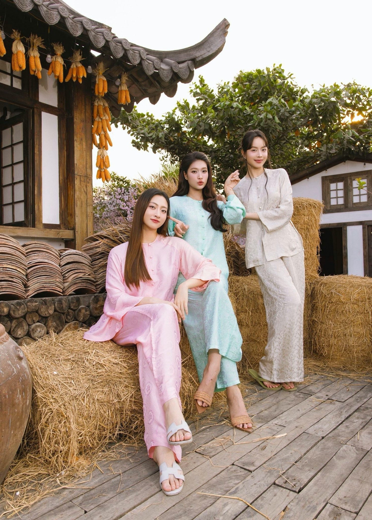 Đáng chú ý, đây đã là năm thứ ba liên tiếp bộ ba mỹ nhân đình đám cùng thực hiện bộ ảnh Tết chung. Thay vì lựa chọn áo dài quen thuộc, cả ba gây bất ngờ khi diện trang phục bà ba với chất liệu lụa tơ tằm mềm mại, gam màu tươi sáng. Thiết kế giản dị nhưng vẫn tôn lên vóc dáng cân đối, thần thái sang trọng và khí chất riêng biệt của từng người đẹp.