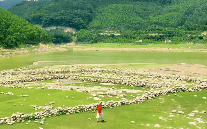 Người ta vẫn rỉ tai nhau rằng đi thác, đi suối thì phải đợi lúc mưa nhiều, nước đổ ầm ầm mới bõ công chiêm ngưỡng. Nhưng sự rập khuôn ấy vô tình làm chúng ta bỏ lỡ một kiệt tác dịu dàng mà mùa hè ban tặng riêng cho Suối Mỡ. Khi những cơn nắng chói chang hong khô bớt dòng chảy cuồn cuộn, phần đáy của lòng hồ rộng lớn bỗng phơi mình ra dưới ánh mặt trời, để lộ những phiến đá muôn hình vạn trạng nhấp nhô tuyệt đẹp.