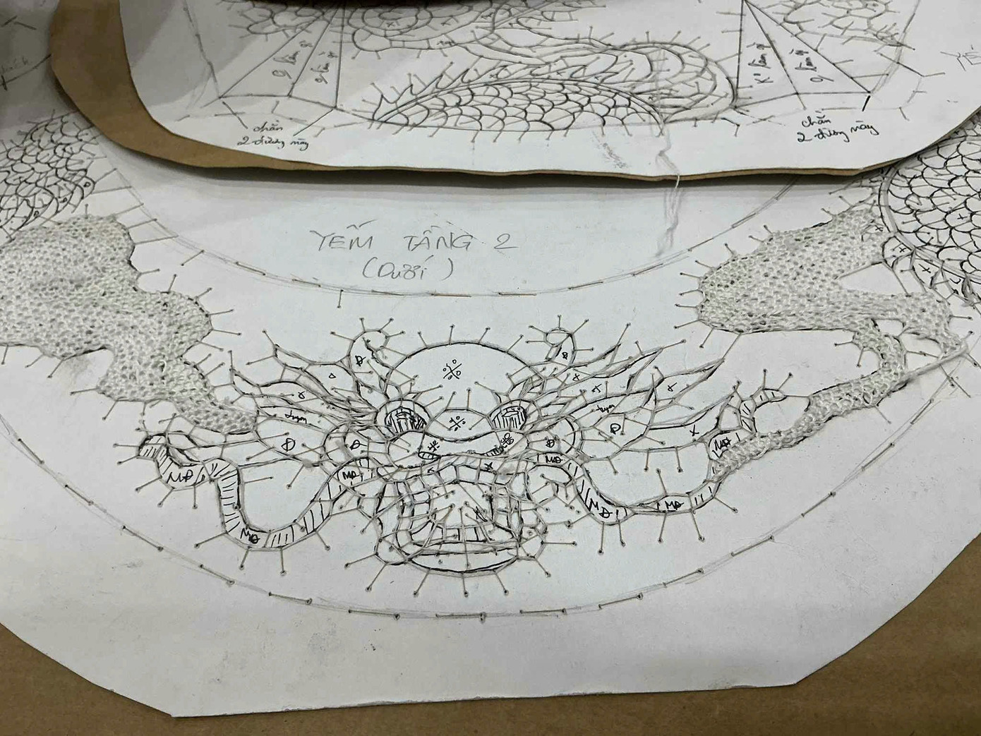 Look 3 tốn nhiều thời gian và công sức cho cả công đoạn nghiên cứu lẫn phát triển. Tôi cần nghiên cứu vẽ lại bức tranh Cửu Long Ẩn Vân sao cho phù hợp với “thời trang” và vừa để các chi tiết nhỏ phải “đủ”, để khi các sợi chỉ được mạng vẫn ra được đường nét.
