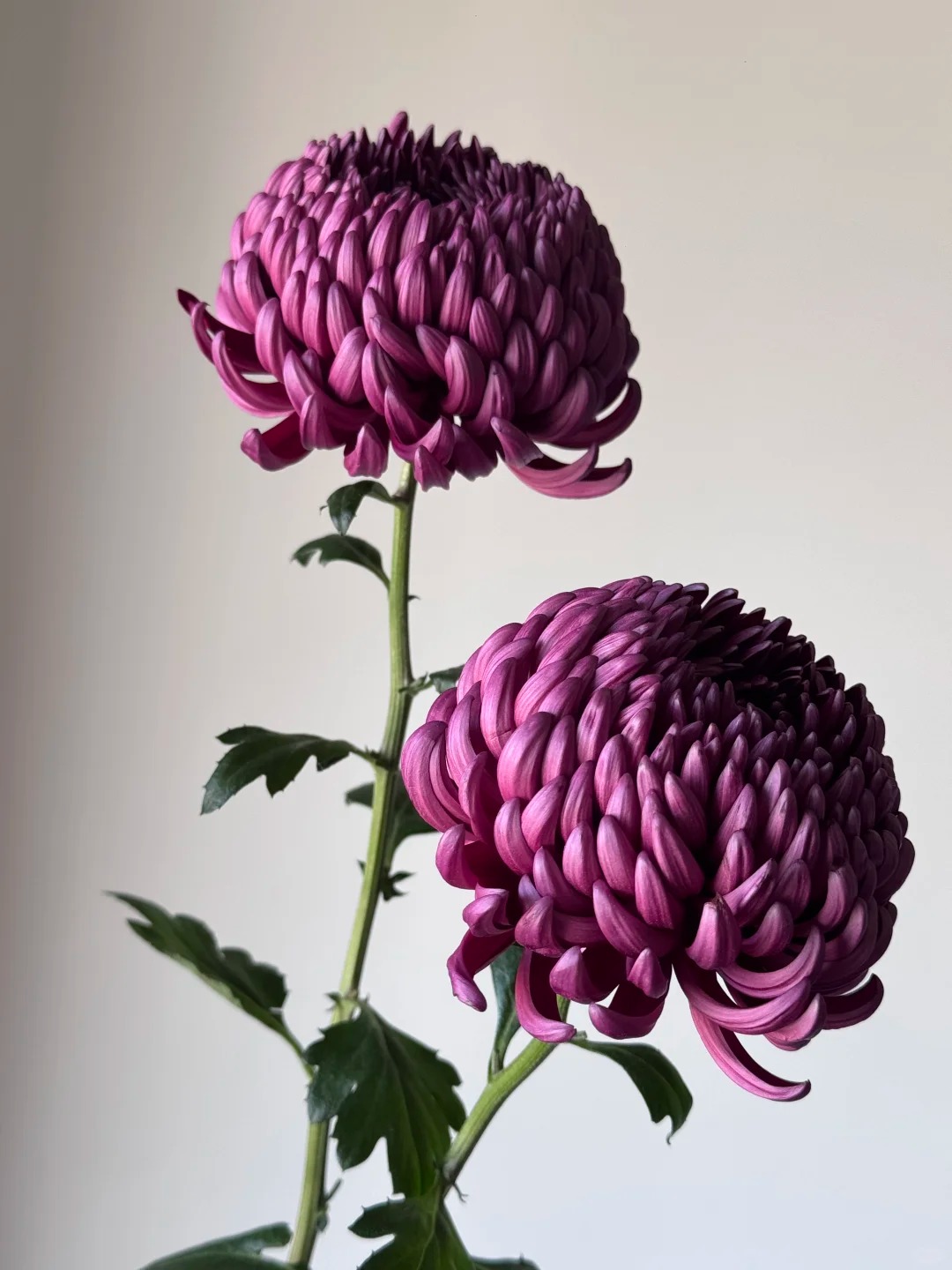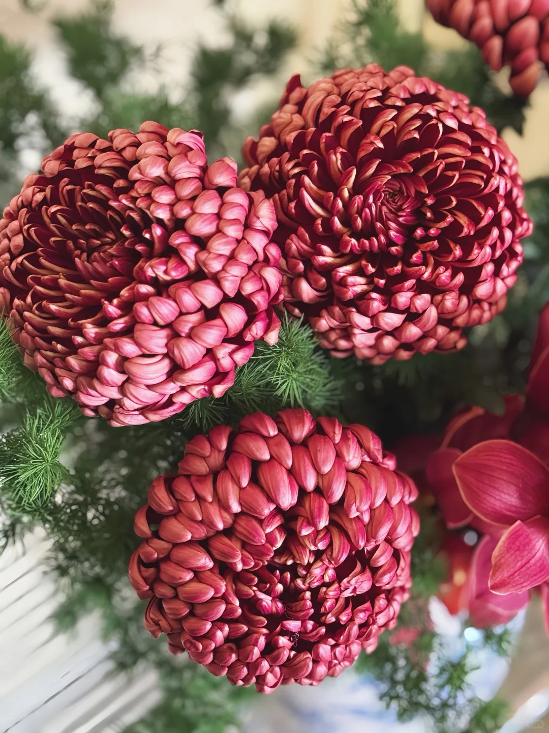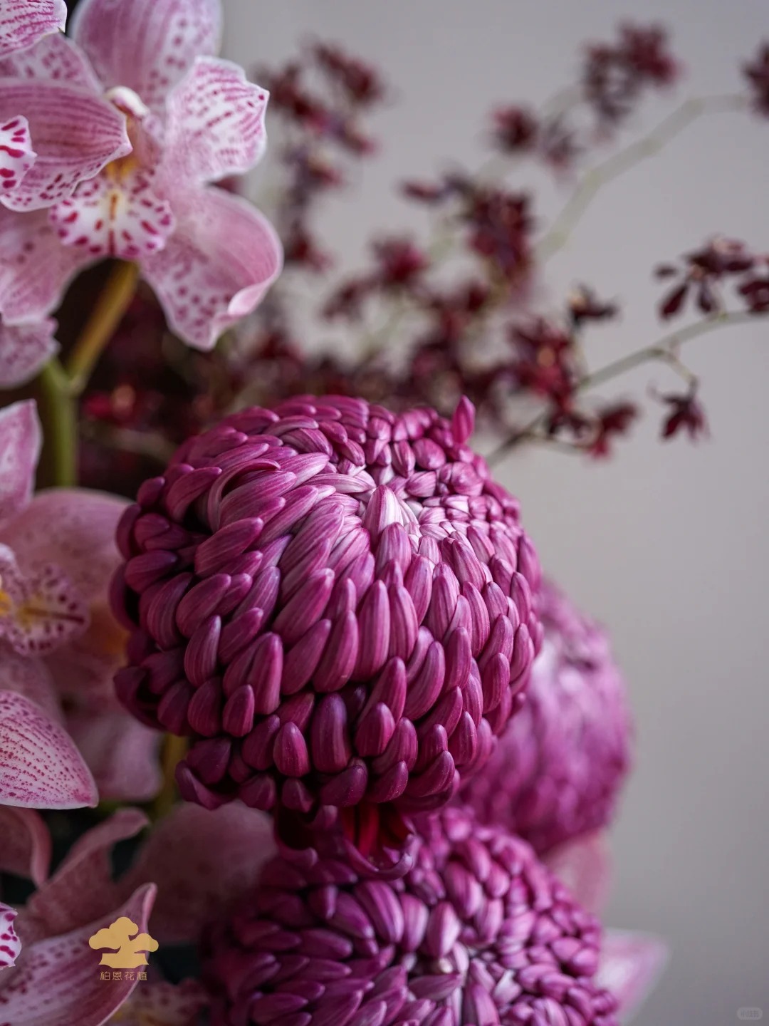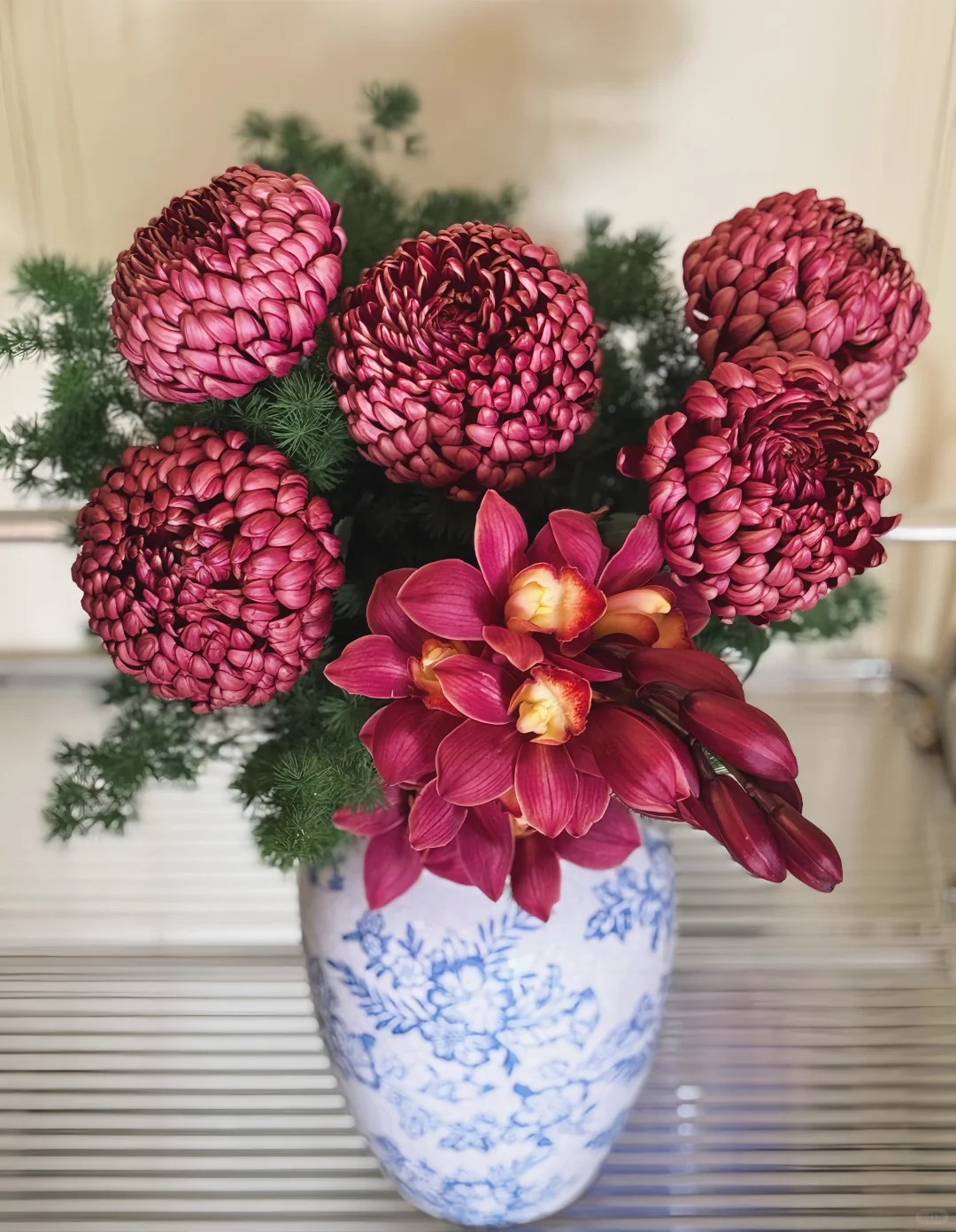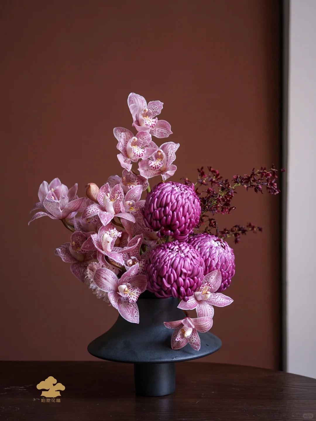 Về cách cắm, cúc mẫu đơn rất "dễ tính". Bản thân mỗi bông hoa đã là một tác phẩm nghệ thuật, nên bạn không cần quá cầu kỳ. Chỉ cần thả 5-7 bông vào một chiếc bình thủy tinh trụ tròn hoặc bình gốm dáng bầu là đã đủ đẹp. Nhưng nếu muốn nghệ thuật hơn, hãy thử kết hợp như những gợi ý trong ảnh: Mix cúc mẫu đơn tím cùng vài cành địa lan (cymbidium) màu hồng phấn hoặc đỏ rượu, điểm thêm vài nhánh lá tùng thơm xanh mướt. Sự kết hợp giữa sự tròn trịa của cúc và nét bay bổng của lan sẽ tạo nên một tổng thể hài hòa, vừa cổ điển lại vừa hiện đại.