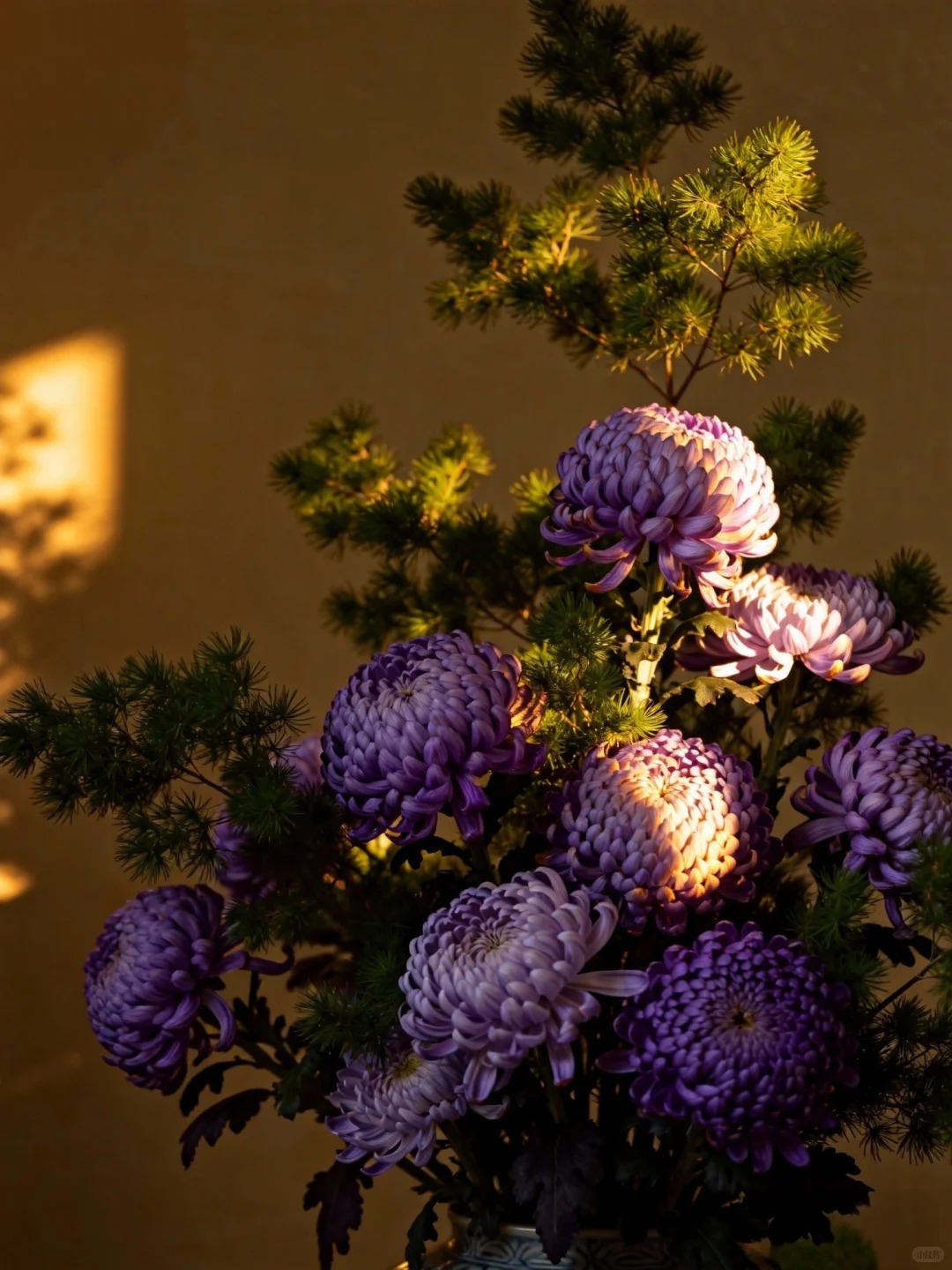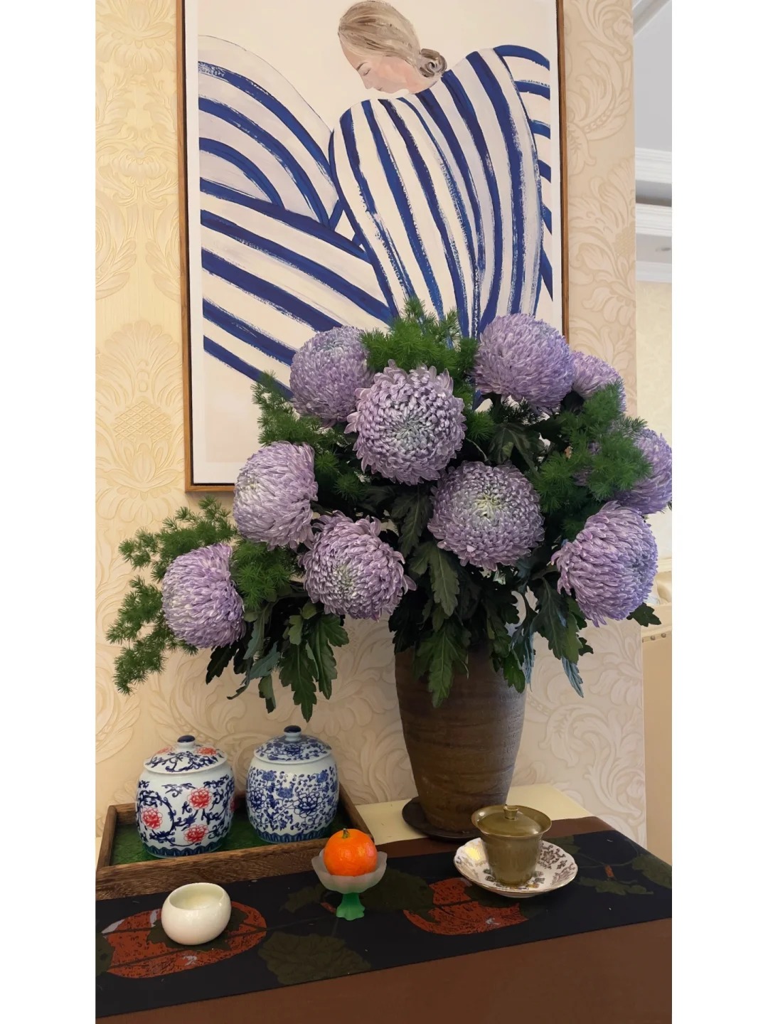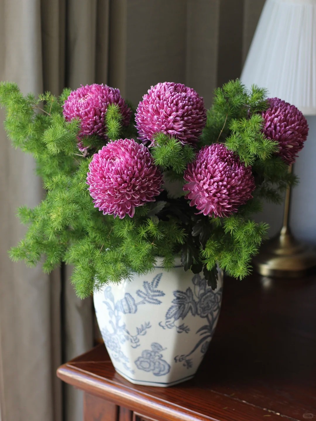 Trong ánh đèn vàng ấm cúng của phòng khách, những bông cúc mẫu đơn tím hiện lên đầy "ma mị" và cuốn hút. Nó tạo ra chiều sâu cho không gian, khiến bình hoa trở thành tâm điểm của mọi ánh nhìn. Màu tím trong phong thủy còn tượng trưng cho sự chung thủy, son sắt và khí chất vương giả. Một bình cúc mẫu đơn tím đặt cạnh bộ sofa màu kem hoặc trên bàn ăn gỗ sẫm màu sẽ ngay lập tức nâng tầm đẳng cấp cho ngôi nhà, mang lại cảm giác tĩnh tại, an yên nhưng vẫn vô cùng sang trọng.