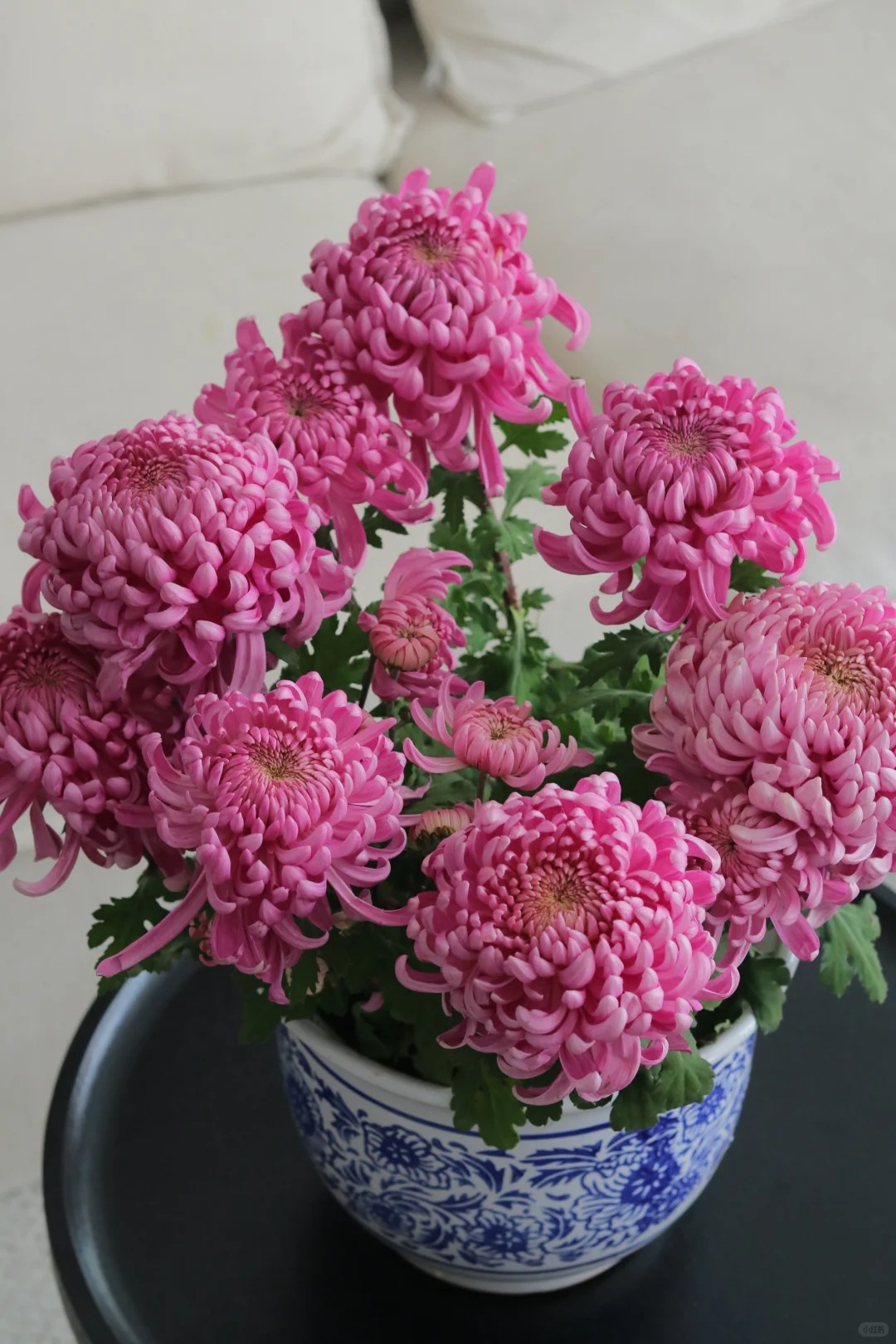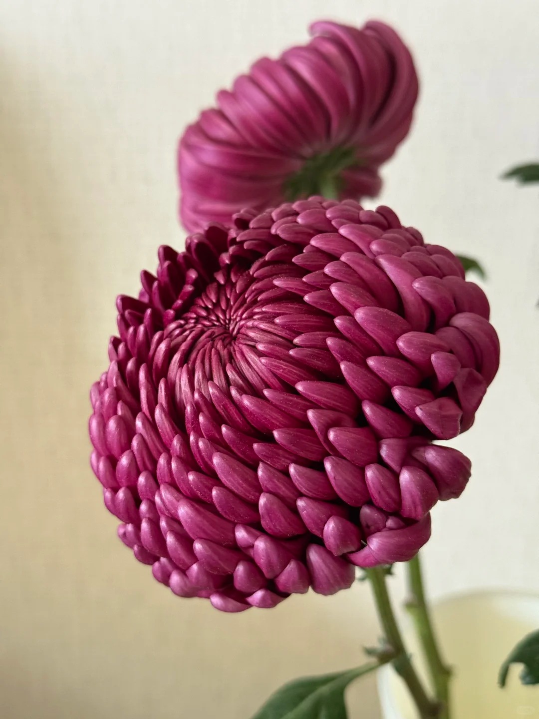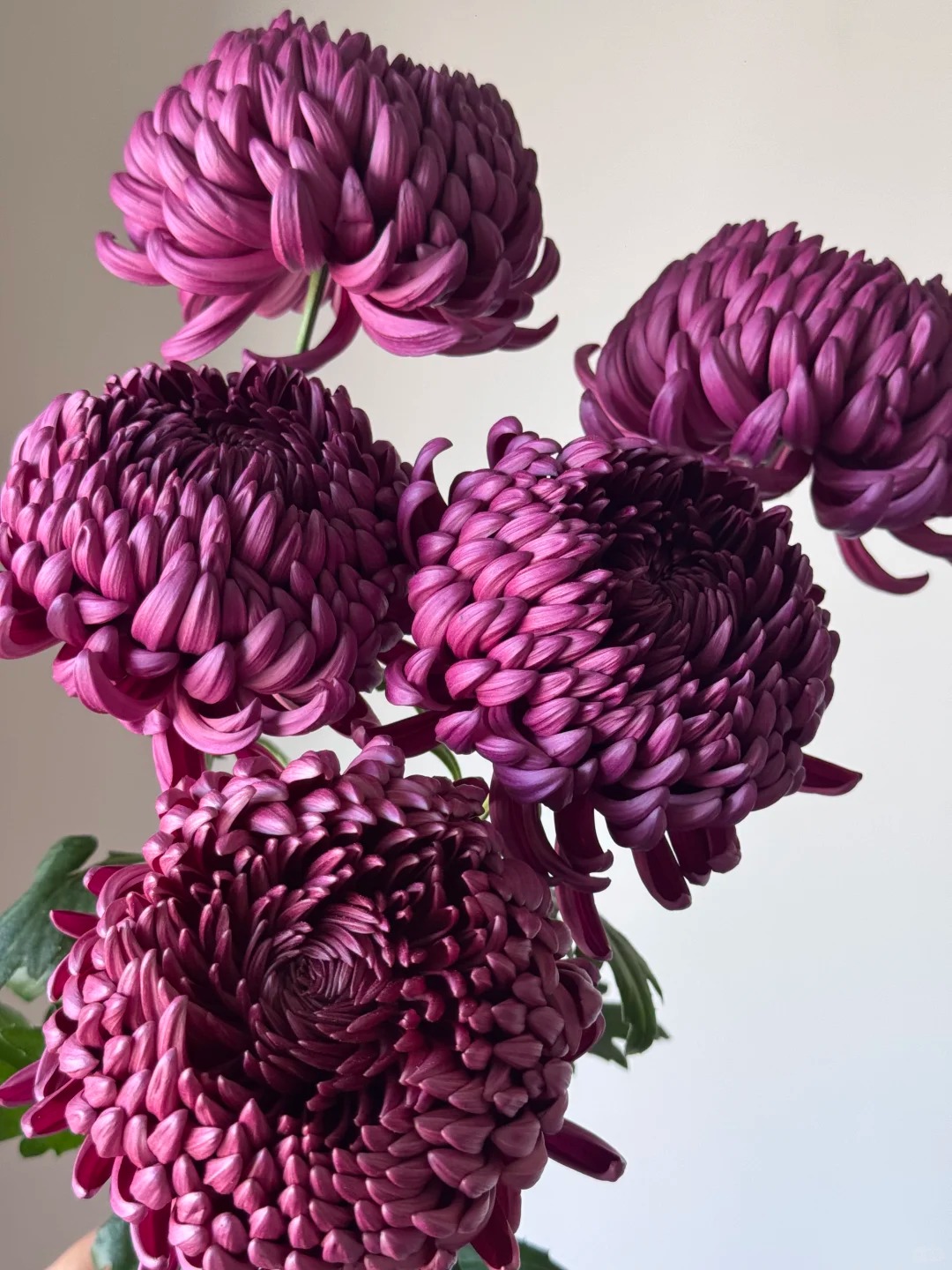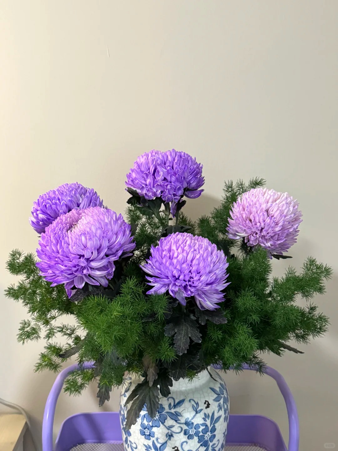 Trong ánh đèn vàng ấm cúng của phòng khách, những bông cúc mẫu đơn tím hiện lên đầy "ma mị" và cuốn hút. Nó tạo ra chiều sâu cho không gian, khiến bình hoa trở thành tâm điểm của mọi ánh nhìn. Màu tím trong phong thủy còn tượng trưng cho sự chung thủy, son sắt và khí chất vương giả. Một bình cúc mẫu đơn tím đặt cạnh bộ sofa màu kem hoặc trên bàn ăn gỗ sẫm màu sẽ ngay lập tức nâng tầm đẳng cấp cho ngôi nhà, mang lại cảm giác tĩnh tại, an yên nhưng vẫn vô cùng sang trọng.