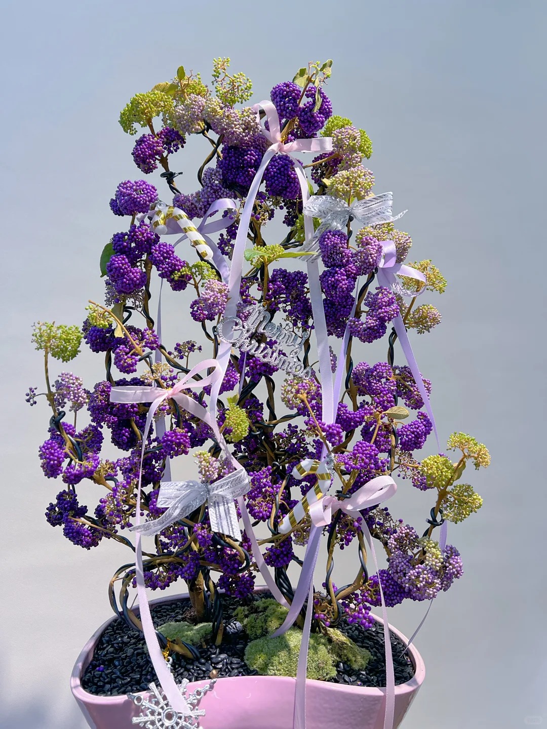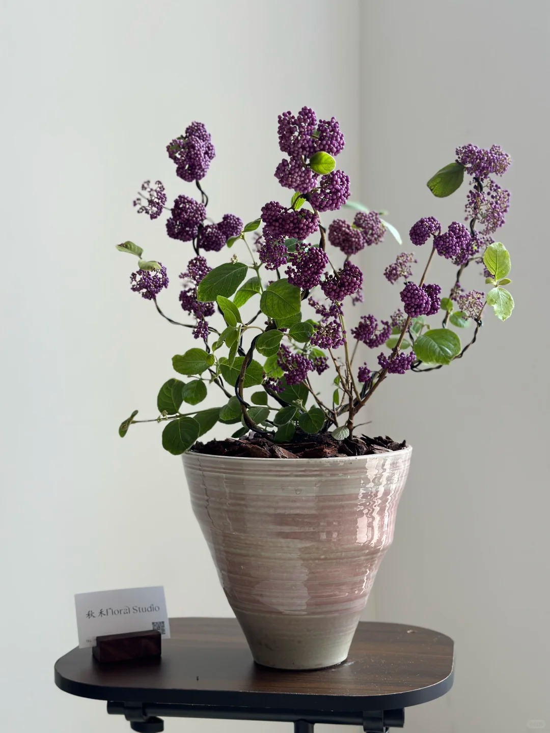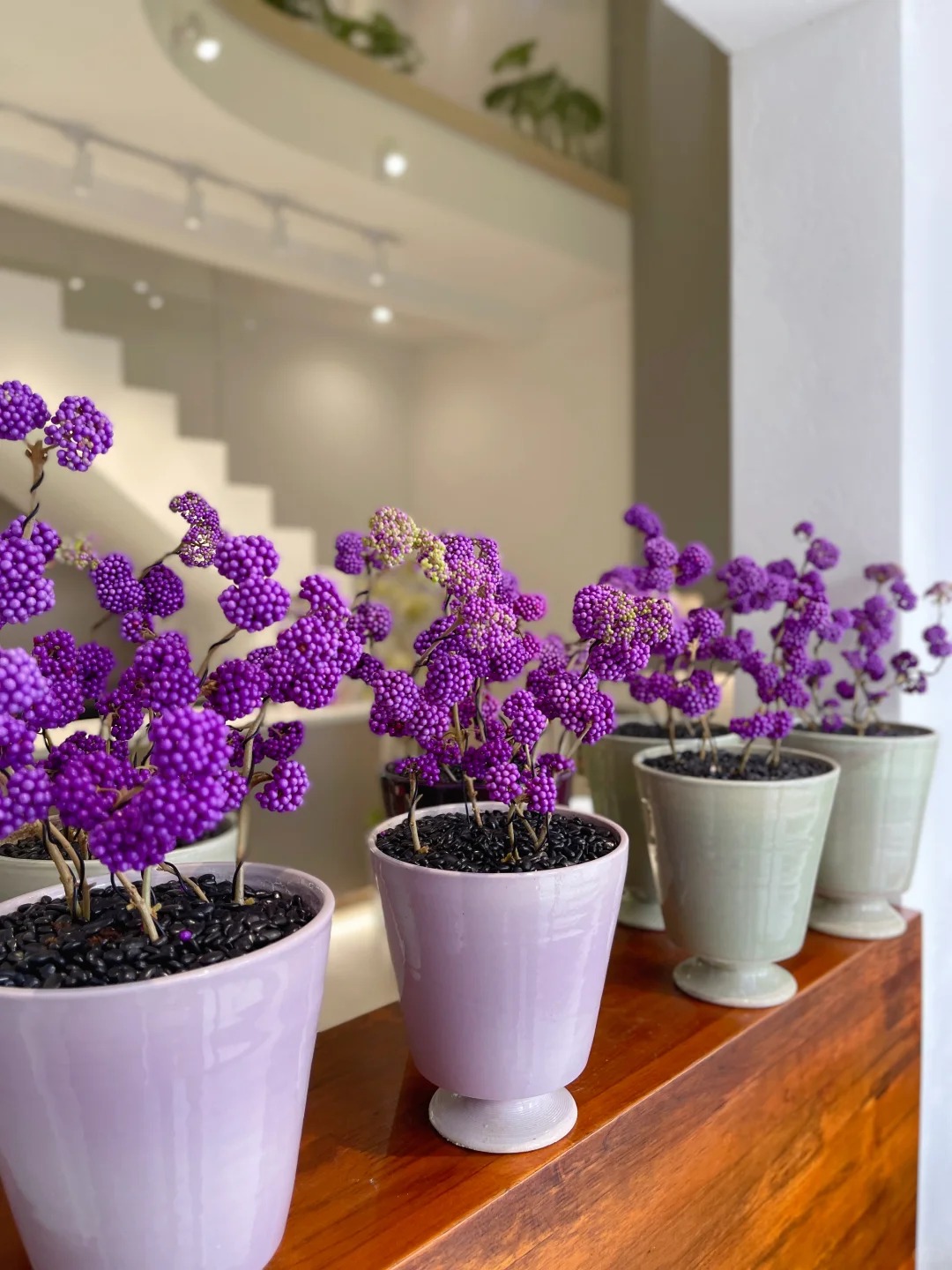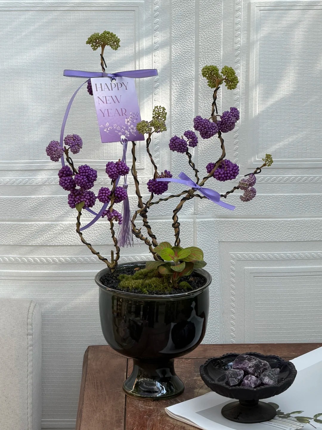 Với những gia đình đã chán cảnh năm nào cũng chỉ đào, mai, ly, cúc, tử châu là lựa chọn rất đáng thử cho mùa Tết sắp tới. Chỉ một bình cắm đơn giản, vài cành cong mềm tạo dáng, để trên nền tường trắng hoặc cạnh ô cửa sổ là đủ để góc nhà trở nên đặc biệt hơn. Mỗi lần đi ngang, ánh tím lấp lánh của chùm quả như kéo tâm trạng lên một chút, nhắc mình về những điều nhẹ nhàng mà Tết mang lại: Sum vầy, bình an và niềm tin vào tương lai.