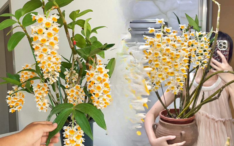 Trong số các loài lan được dân chơi hoa yêu mến những năm gần đây, kiều vàng (tên khoa học là Dendrobium thyrsiflorum, thuộc chi Thạch hộc - Dendrobium) đang dần trở thành cái tên được săn đón. Không phải vì nó hiếm, cũng chẳng phải vì đắt, mà bởi cái duyên rất riêng: Hoa nở thành từng chùm tròn trịa, cánh trắng muốt ôm lấy nhụy vàng rực rỡ, buông xuống từ thân cây như những chiếc đèn lồng nhỏ đung đưa trong gió. Người Trung Quốc thậm chí còn ví loài hoa này là "hoa đèn lồng đẹp nhất trần gian", và quả thực, ai đã một lần thấy giò kiều vàng nở rộ giữa hiên nhà đều phải khựng lại ngắm nhìn.