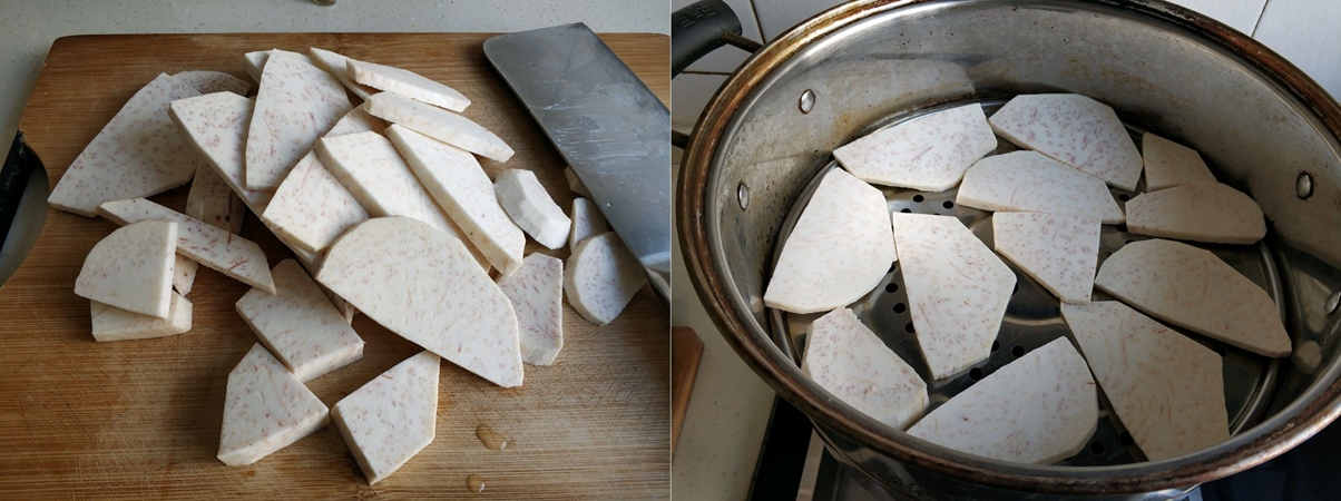 Bước 1: Khoại môn gọt vỏ, rửa sạch rồi thái thành các lát mỏng. Sau đó cho khoai môn vào xửng rồi đặt lên nồi hấp. Bật bếp và hấp khoai môn cho đến khi chín.