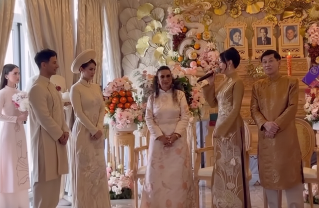 Trong buổi lễ, cô dâu và chú rể cùng diện áo dài thêu hoa sen – biểu tượng văn hóa Việt Nam. Tiên Nguyễn đội mấn, cầm bó hoa cưới, còn Justin Cohen chọn áo dài cùng tông, tạo nên hình ảnh hài hòa trong các nghi thức truyền thống.