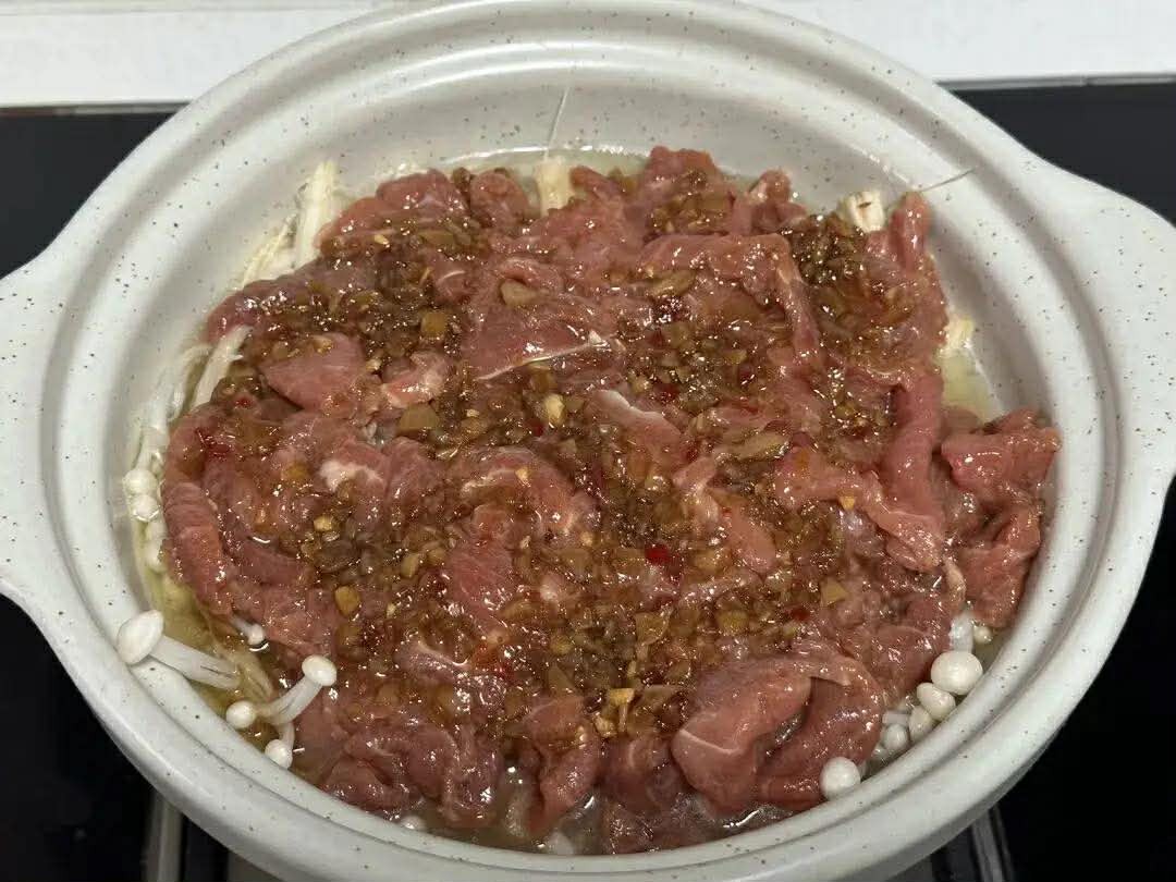 Nói về hương vị, món ăn này thực sự tuyệt vời. Những lát thịt bò được phủ một lớp tinh bột mỏng và hầm chín hoàn hảo trong nồi đất, mềm nhưng vẫn dai. Đặc biệt đối với những người thích thịt có độ dai hơn một chút, hãy hầm lâu hơn một chút; thịt bò sẽ săn lại, càng thêm ngon miệng. Nấm kim châm ngấm nước thịt và hương thơm của tỏi băm, trở nên tươi ngon, mọng nước và hơi giòn – thậm chí còn hấp dẫn hơn cả thịt. Phần ngon nhất chính là nước dùng ở đáy nồi, sánh mịn và bóng bẩy. Múc một thìa nước dùng lên cơm nóng; hương vị đậm đà pha chút ngọt dịu. Một miếng cơm, một miếng thịt, và trước khi bạn kịp nhận ra, bạn đã ăn hết cả một bát.