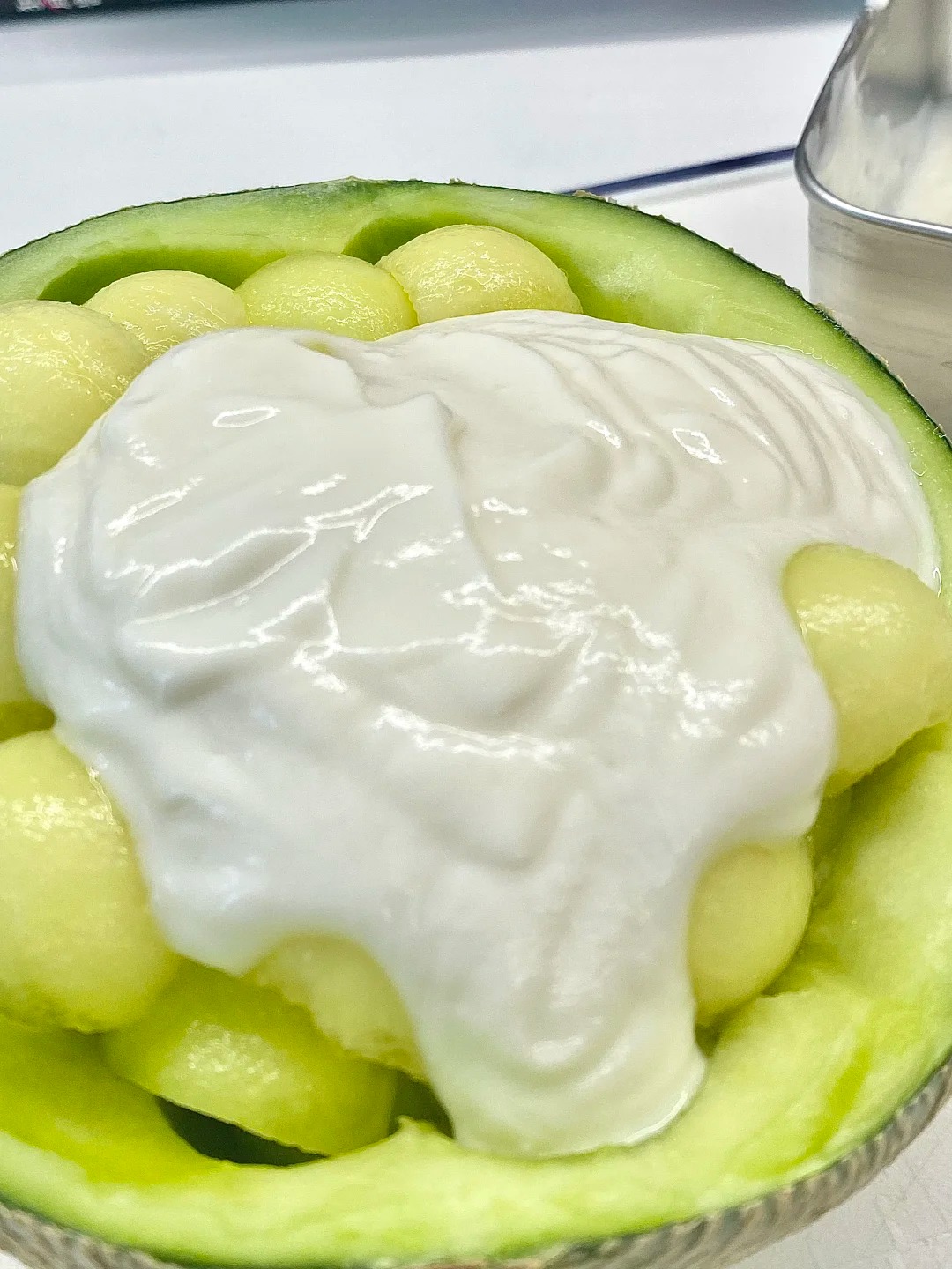 Một bí mật nhỏ để món ăn ngon hơn gấp bội: Sau khi hoàn thành, đừng vội ăn ngay. Hãy đậy nắp vỏ dưa lại, bọc kín và để vào ngăn mát tủ lạnh khoảng 30 phút. Thời gian này giúp hơi lạnh thấm sâu vào từng thớ dưa, sữa chua định hình tốt hơn và các hương vị có thời gian hòa quyện vào nhau. Khi lấy ra, lớp vỏ dưa lạnh toát, bên trong đặc dẻo, cảm giác xúc thìa vào "đã" hơn rất nhiều.