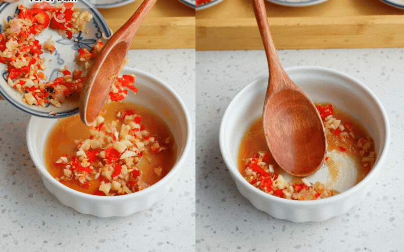 Khuấy đều cho đường tan hoàn toàn rồi mới cho tỏi băm và ớt băm vào. Việc cho tỏi ớt sau cùng giúp chúng nổi bồng bềnh trên mặt nước mắm, trông cực kỳ đẹp mắt. Tùy vào khẩu vị gia đình, bạn có thể gia giảm độ mặn ngọt cho phù hợp nhé.
