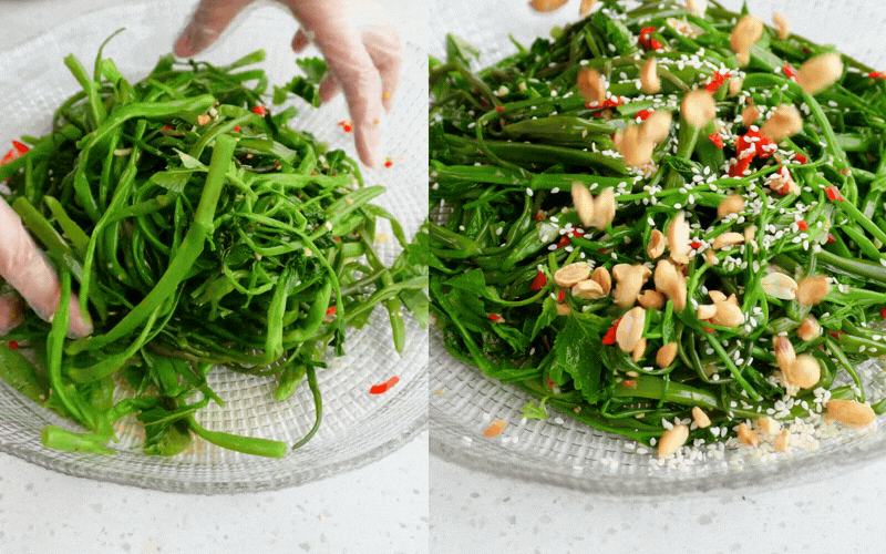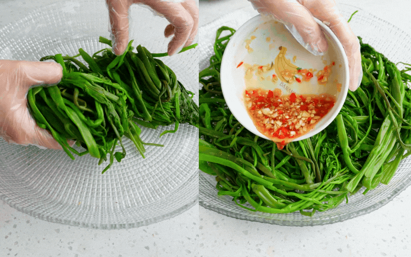 Cho phần rau muống đã vắt kiệt nước vào một cái tô lớn. Đổ từ từ nước mắm chua ngọt vào, thêm các loại rau thơm cắt nhỏ (kinh giới, rau răm, húng lủi). Đeo găng tay nilon và bóp trộn thật đều tay cho gia vị thấm sâu vào từng cọng rau.