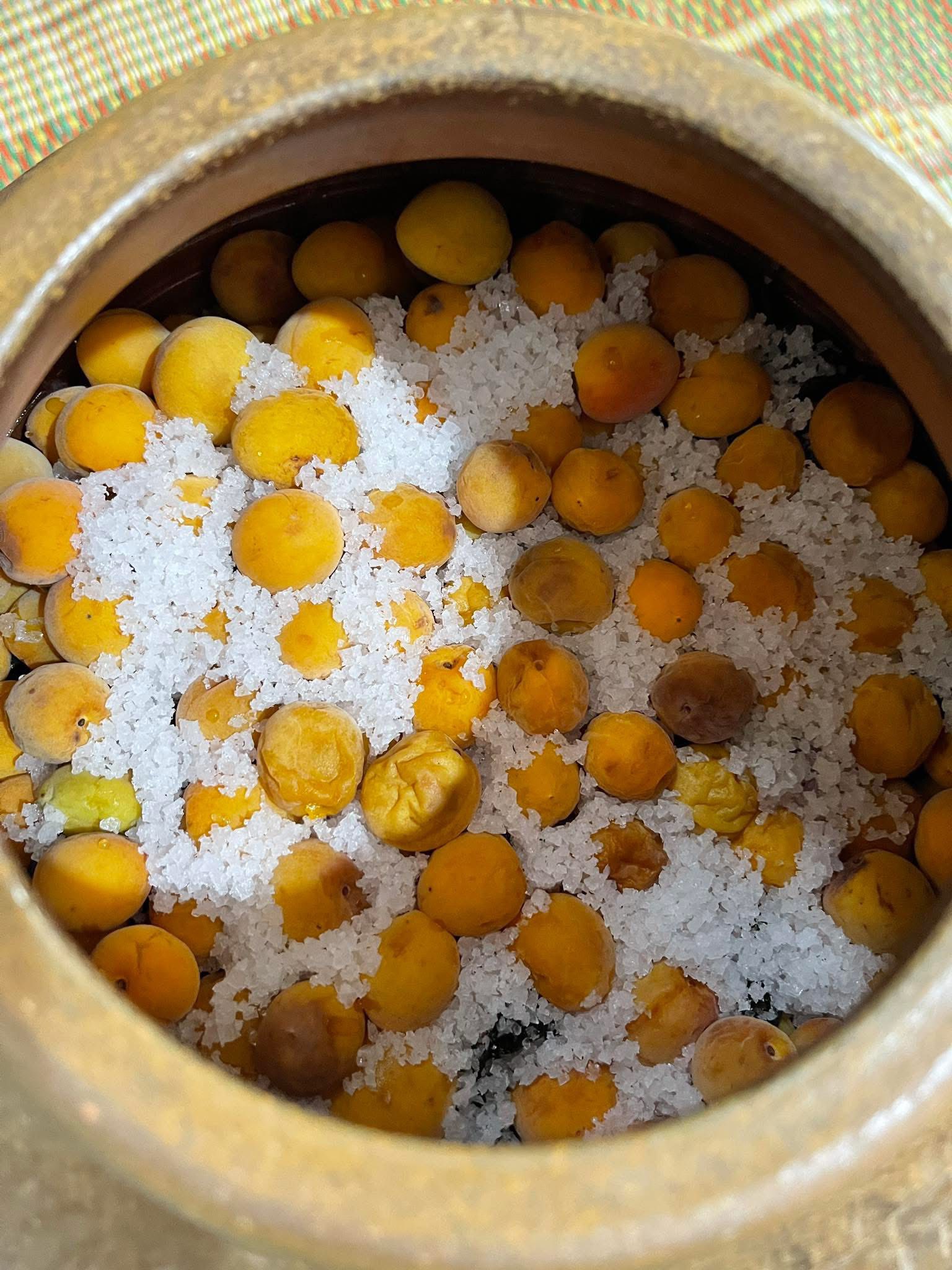 Bạn xếp một lớp mơ, rải một lớp đường và một chút xíu muối, lặp lại cho đến khi đầy bình, nhớ chừa lại khoảng cách từ mặt đường trên cùng đến nắp bình tầm vài centimet để mơ có không gian "thở". Lớp trên cùng phải là lớp đường phủ kín mặt quả. Đậy nắp thật kín và đặt bình ở góc bếp thoáng mát.