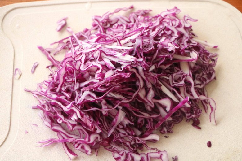Bước 1: Đầu tiên, thái nhỏ bắp cải tím, rửa sạch và để thật ráo nước, sau đó cho vào thố trộn. Tiếp theo bạn thái táo thành từng lát rồi xắt sợi hoặc dùng dụng cụ bào thành sợi nhỏ. Đừng bào táo quá nhỏ, nếu không nó sẽ bị nát khi trộn, cho vào thố. Tiếp theo, cho một ít rau mùi vào. Rau mùi là linh hồn của món ăn này; bạn có thể cho thêm nếu thích.