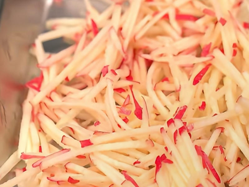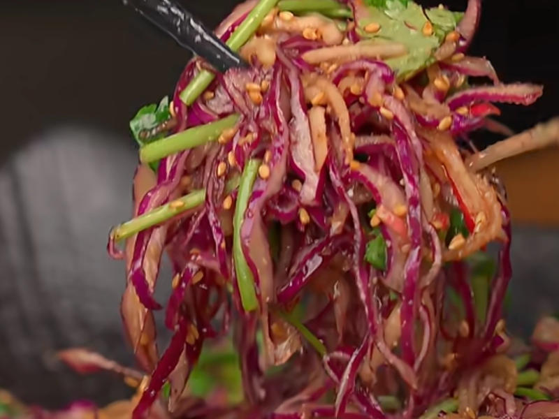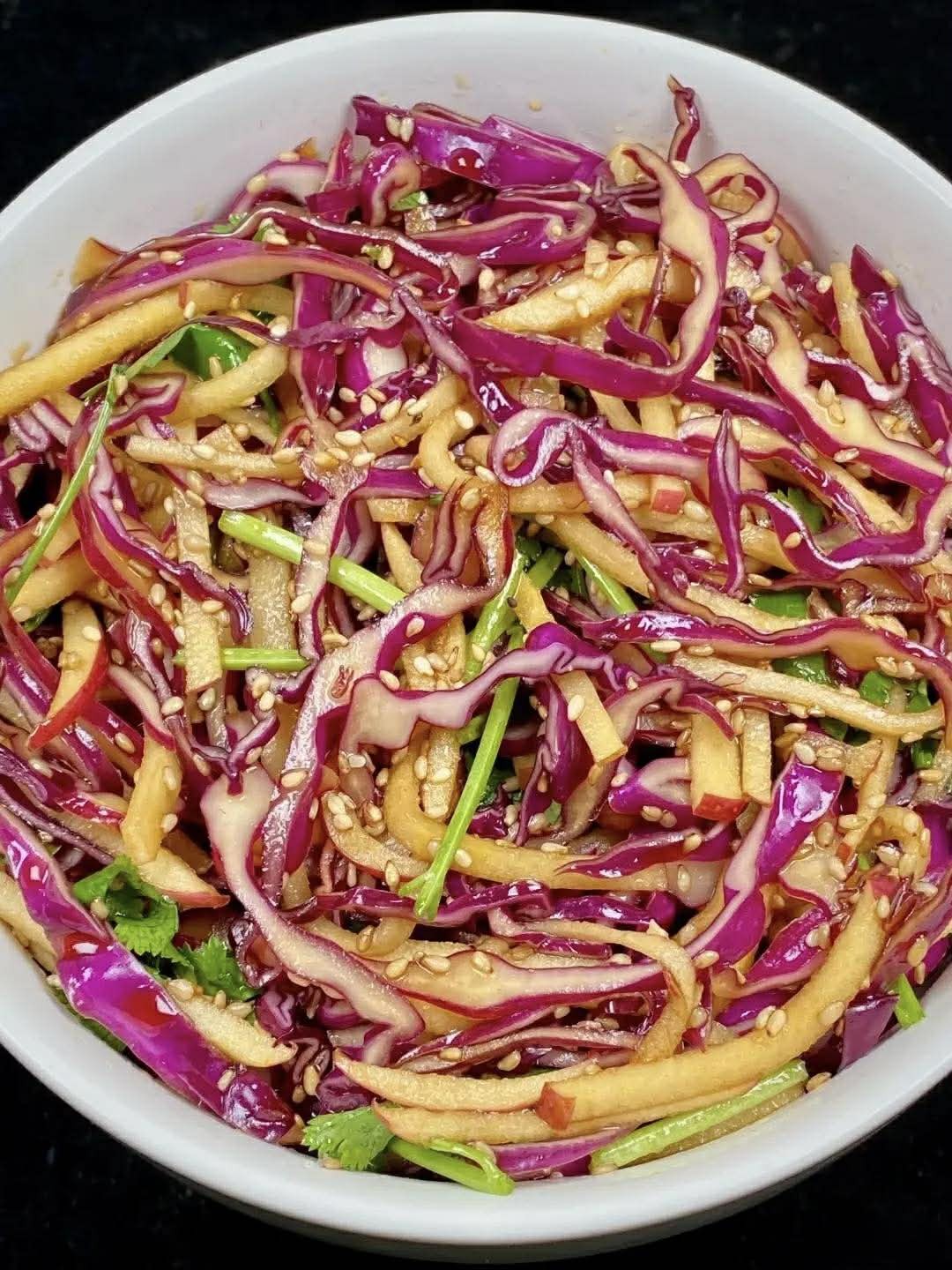 Điểm nổi bật: Bắp cải tím thái sợi giòn tan và táo thái sợi ngọt ngào tạo nên một món ăn hấp dẫn cả về hình thức lẫn hương vị. Bắp cải tím giàu anthocyanin và chất xơ, trong khi táo cung cấp pectin và vitamin. Sự kết hợp này tạo nên vị chua ngọt ngon miệng và ít calo. Không cần dùng nhiều dầu mỡ hay gia vị, món ăn này rất thích hợp làm dùng làm món ăn kèm hoặc ăn nhẹ trong giai đoạn giảm cân.