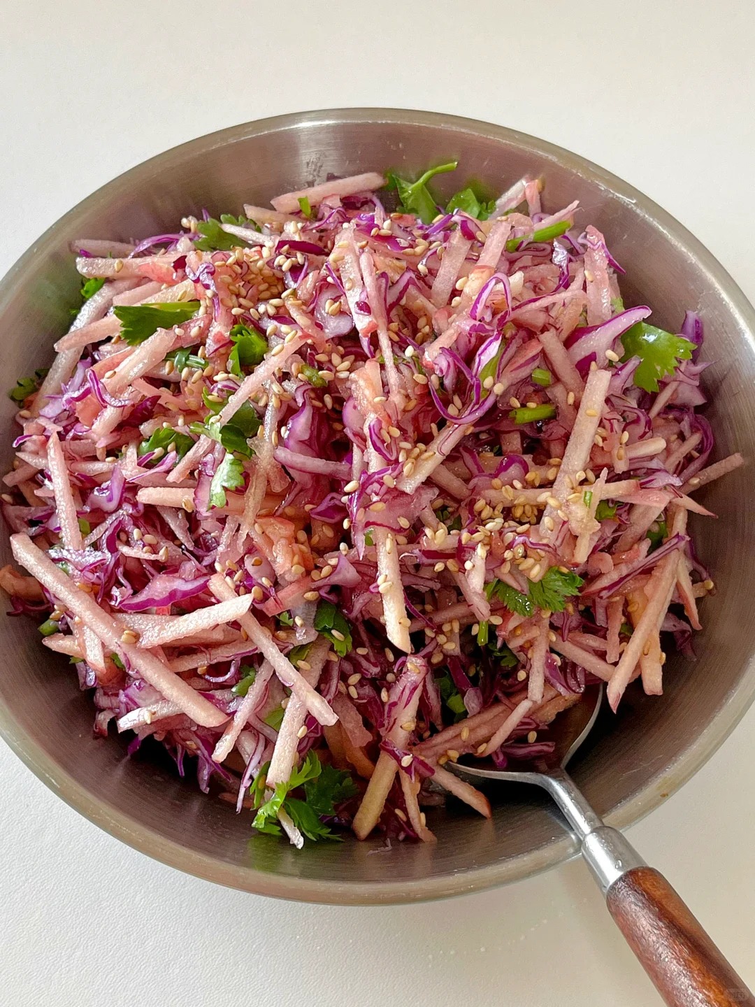 Nguyên liệu: 1/2 chiếc bắp cải tím, 1 quả táo (hãy chọn loại táo giòn), một chút rau mùi, 1 thìa canh giấm balsamic và một chút muối, 1 thìa canh nước tương, một chút hạt mè trắng rang.