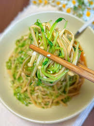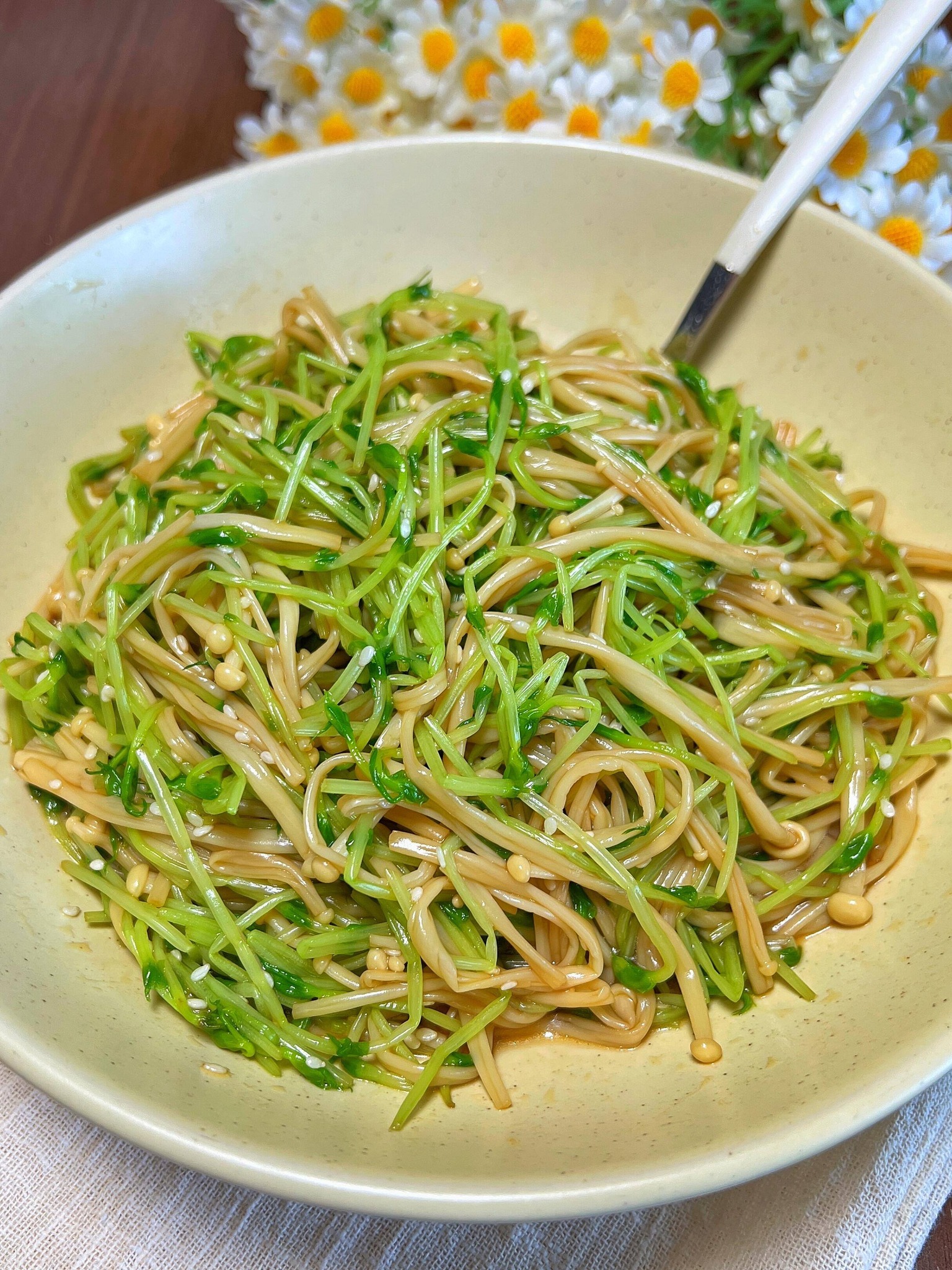Điểm nổi bật: Rau mầm là loại nguyên liệu rất ngon và giàu dinh dưỡng rất đáng có trên bàn ăn vào mùa xuân. Chúng thơm, giòn và thanh mát, tươi mềm, kết hợp với nấm kim châm tạo nên kết cấu mượt mà. Đây là món ăn kiểu nhà làm đơn giản, rất ngon miệng, ít béo và giàu chất dinh dưỡng. Chần rau mầm trong 30 giây rồi rửa lại bằng nước lạnh để giữ được độ giòn.