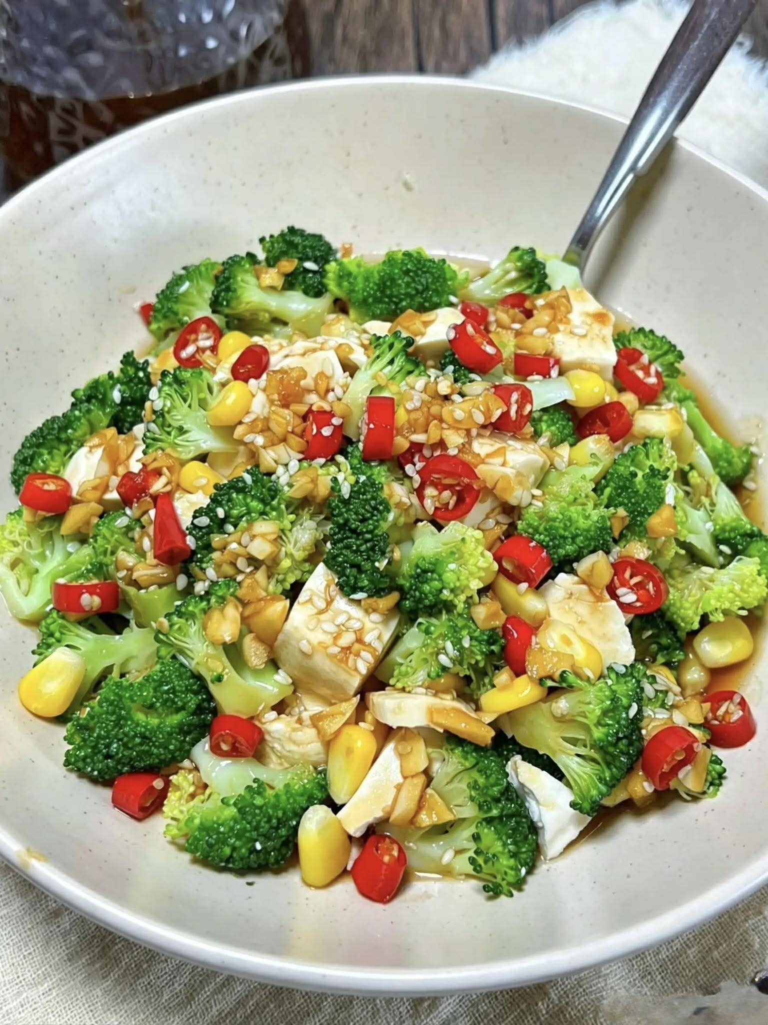 Điểm nổi bật: Bông cải xanh giòn, đậu phụ mềm mịn và hạt ngô ngọt kết hợp tạo nên hương vị đậm đà, hấp dẫn. Đậu phụ cung cấp protein thực vật, trong khi bông cải xanh và ngô cung cấp chất xơ, món ăn này giúp bạn no bụng mà vẫn ít calo. Món salad này chỉ cần một lượng dầu và muối tối thiểu, rồi trộn đơn giản là đã có một món ăn tươi mát, ngon miệng. Món này phù hợp làm món chính hoặc món ăn kèm trong giai đoạn giảm cân, và được cả người lớn lẫn trẻ em yêu thích.