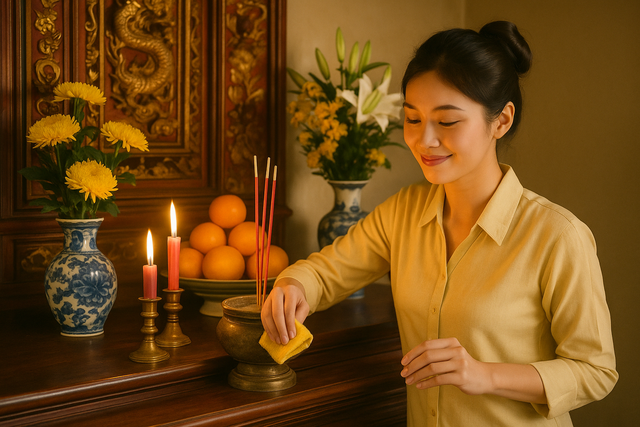 Điều quan trọng là sự sạch sẽ, chỉn chu: Lau bụi thường xuyên, thay nước, thay hoa, dọn chân hương định kỳ. Đó chính là "nếp nhà" trong phiên bản hiện đại không khoe khoang, không phô trương, nhưng mỗi lần ngẩng lên nhìn vẫn thấy lòng mình lắng lại.