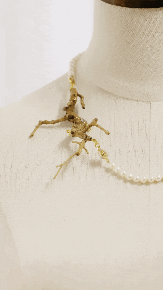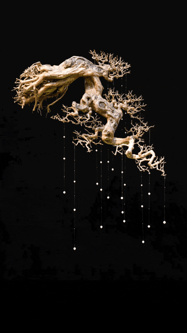 Trong tác phẩm “Chuyển hóa bất tận”, cô dùng một cây cửu lý hương hơn 50 năm tuổi, treo lên đó 18 chuỗi ngọc trai. 18 năm là quãng thời gian bố cô nuôi dưỡng, uốn nắn cây; còn ngọc trai vốn chỉ là hạt cát nhỏ, phải đi qua thời gian và biến đổi mới trở nên lấp lánh. Với cô, đó là hình ảnh của bố và bonsai kiên nhẫn, lặp đi lặp lại, rồi một ngày kết thành vẻ đẹp.