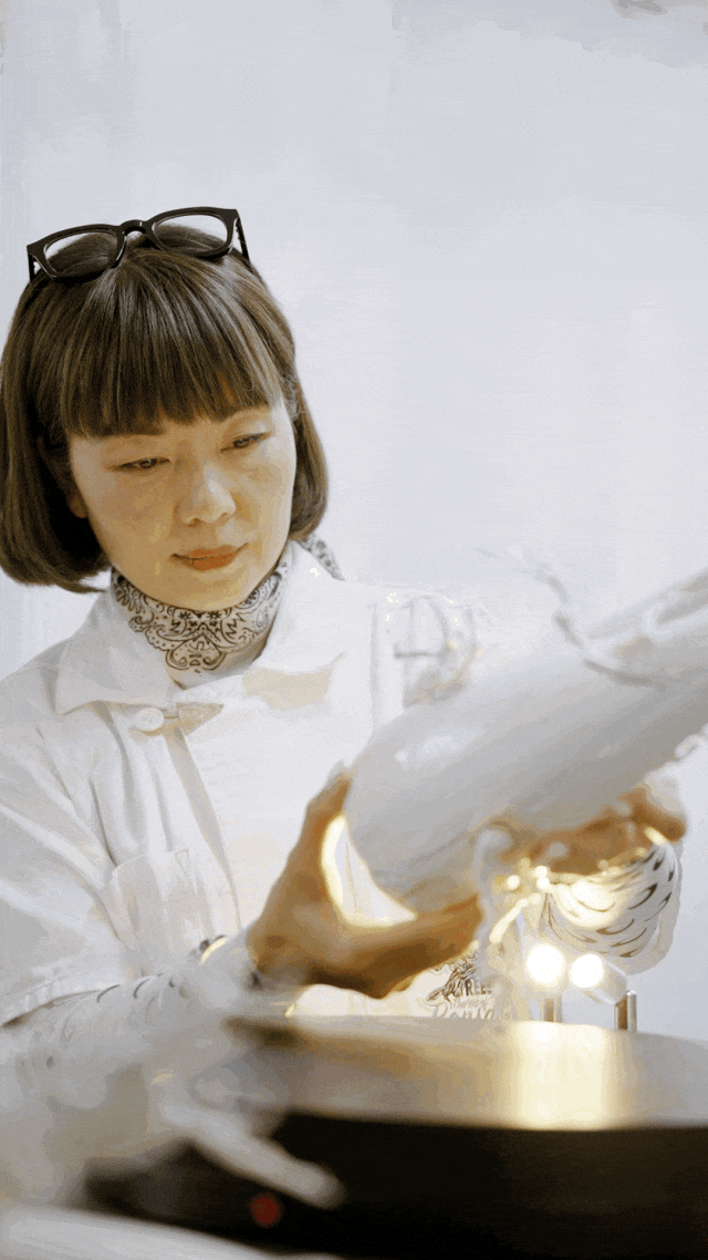 Ở một tác phẩm khác tên “Cởi áo thay gấm”, cô lấy một thân cây khô, gắn nam châm giấu trong cành, để có thể lắp được nhiều “bộ cành” khác nhau: Có bộ mang họa tiết men lam thanh nhã, có bộ phủ màu vàng kim sang trọng. Cô bảo, đó là cách mô phỏng kỹ thuật “ghép cành” mà bố vẫn làm trên cùng một gốc đỗ quyên, ông có thể ghép nhiều màu hoa khác, để khi nở là một bức tranh rực rỡ.