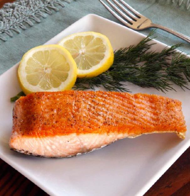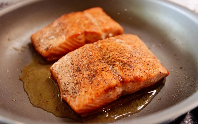 Bước 2: Đun nóng chảo ở mức lửa vừa, thêm một ít dầu ô liu rồi cho cá hồi vào chảo và chiên cho đến khi vàng nâu cả hai mặt (khoảng 2-3 phút mỗi mặt). Sau đó bạn lấy cá hồi ra đĩa, vắt một chút nước cốt chanh lên rồi ăn kèm với các loại rau hoặc cơm.