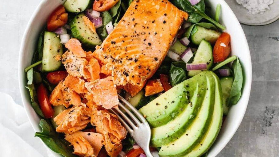 Nguyên liệu: Cá hồi, quả bơ, rau xà lách, cà chua bi, dầu ô liu, nước cốt chanh.