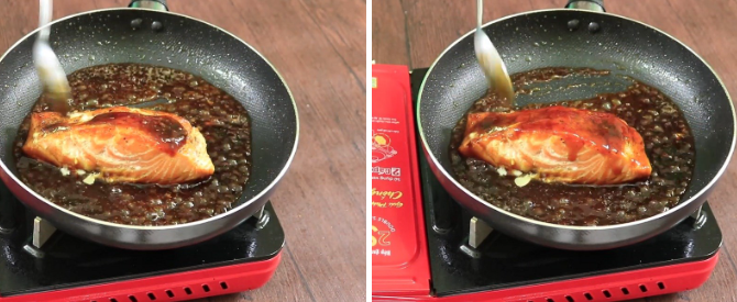 Bước 2: Tiếp theo bạn cho cá đã chiên vào nồi sốt teriyaki, nấu trong khoảng 1-2 phút. Khi nấu bạn hãy dùng thìa rưới đều sốt teriyaki lên miếng cá hồi để gia vị thấm đều và món ăn thêm bắt mắt. Khi nước sốt đã sánh lại thì lấy ra đĩa, rắc một ít hạt mè lên trên để trang trí.