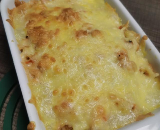 Bước 2: Thêm cơm vào và xào cho đến khi tơi xốp. Sau đó bạn trút vào các thố sứ dùng cho lò nướng (hoặc bát), rắc một lớp phô mai mozzarella lên trên. Sau đó đặt vào trong lò nướng và bật lò ở nhiệt độ 180℃ trong 10 phút cho đến khi phô mai mozzarella vàng nâu.
