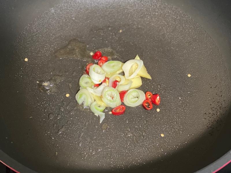 Bước 2: Gốc hành lá thái nhỏ, ớt cắt miếng mỏng. Cho một ít dầu vào chảo, sau đó thêm hành lá, gừng và ớt vào xào đến khi dậy mùi thơm. Tiếp theo cho nhộng tằm vào và xào nhỏ lửa cho đến khi nghe thấy tiếng xèo xèo. Khi bề mặt nhộng trở nên căng, thì bạn có thể thêm chút ớt bột, gia vị rồi đảo đều cho thơm.