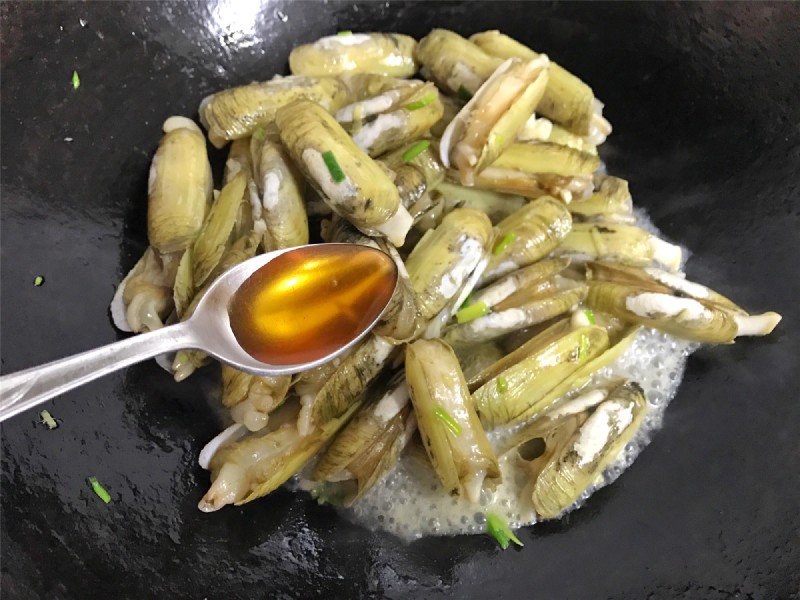 Bước 2: Đặt chảo lên bếp, đun nóng rồi cho một chút dầu ăn vào. Khi dầu nóng thì thêm tỏi, gừng, gốc hành lá vào xào đến khi dậy mùi thơm. Tiếp theo trút ốc móng tay vào chảo, đảo đều ở lửa lớn khoảng 2–3 phút để chúng mở miệng hoàn toàn. Sau đó thêm rượu nấu ăn, gia vị, sa tế vào rồi xào đều. Khi thấy ốc móng tay chín đều, hòa quyện và thấm sốt thì tắt bếp. Rắc phần lá hành vào trước khi lấy món ăn ra đĩa.