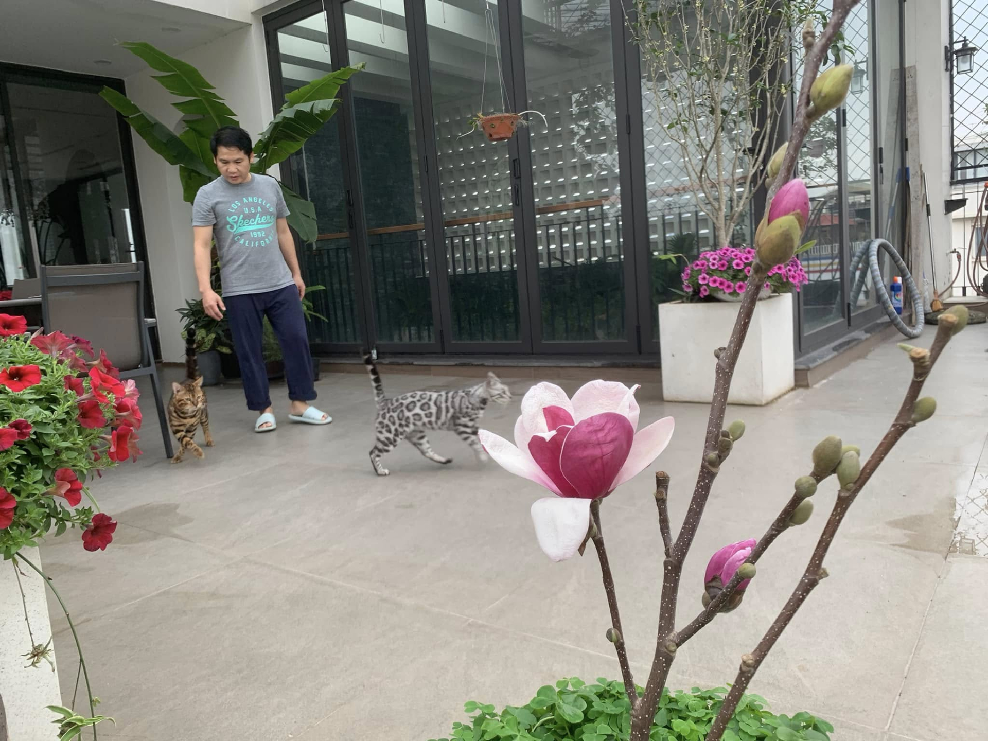 Điểm nhấn đặc biệt trong ngôi nhà là khuôn viên xanh mát với hồ cá koi được thiết kế công phu. Trên sân thượng, nam ca sĩ dành nhiều diện tích để trồng cây cảnh, hoa cỏ và rau xanh. Đây cũng là nơi anh tìm về sau những giờ làm việc căng thẳng, tận hưởng cuộc sống yên bình giữa lòng phố thị.