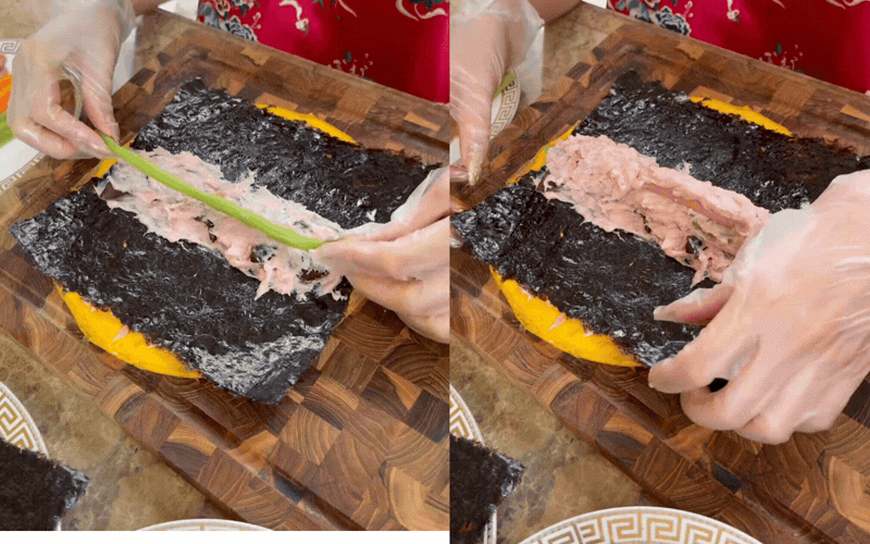 Nhìn đĩa nem chả của Ngọc Loan, người ta không thấy mùi của khói lửa nhà bếp thông thường, mà thấy cả một bầu trời nghệ thuật. Lớp chả phượng lôi cuốn ánh nhìn bởi sự xen kẽ màu sắc đầy tính toán: Lớp viền vàng óng ả của trứng tráng mỏng, sắc cam rực rỡ của cà rốt, màu xanh ngọc của đậu ve, chút đen tuyền mộc mạc của rong biển và nấm mèo, bao bọc lấy phần giò sống trắng ngần. Để khi nhát dao đưa xuống cắt thành từng lát mỏng, người ta phải ồ lên vì mỗi miếng chả trông hệt như một chiếc lông phượng hoàng đang bung nở rực rỡ.