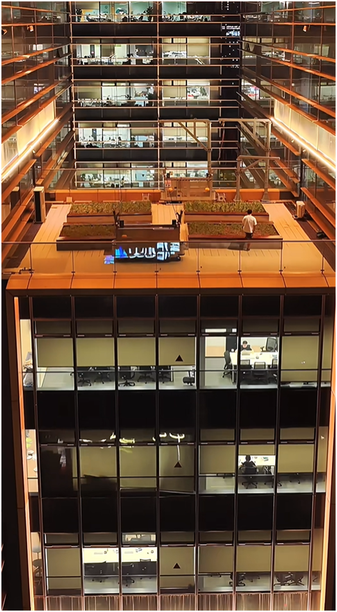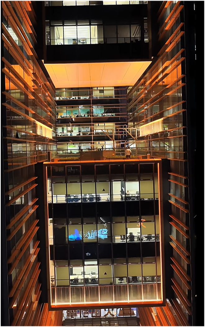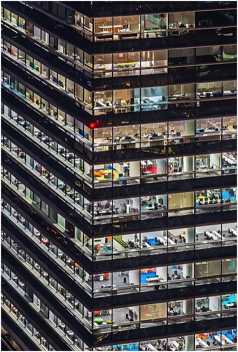 Tòa nhà WeBank (WeZhong), Tại khu Tiền Hải, Thâm Quyến, Trung Quốc. Khi dòng người tan ca đổ xô về nhà thì hầu khắp các văn phòng vẫn sáng đèn.