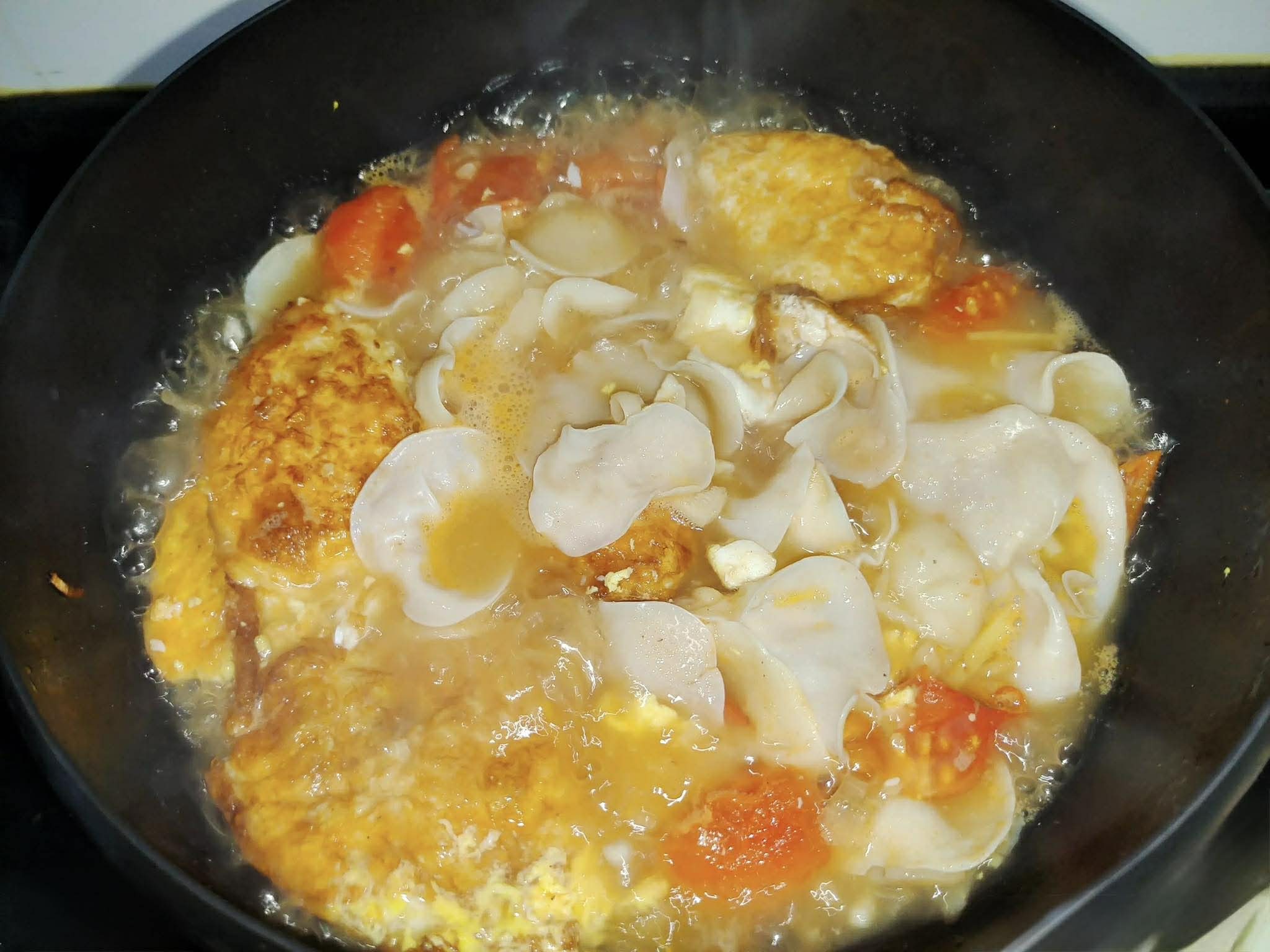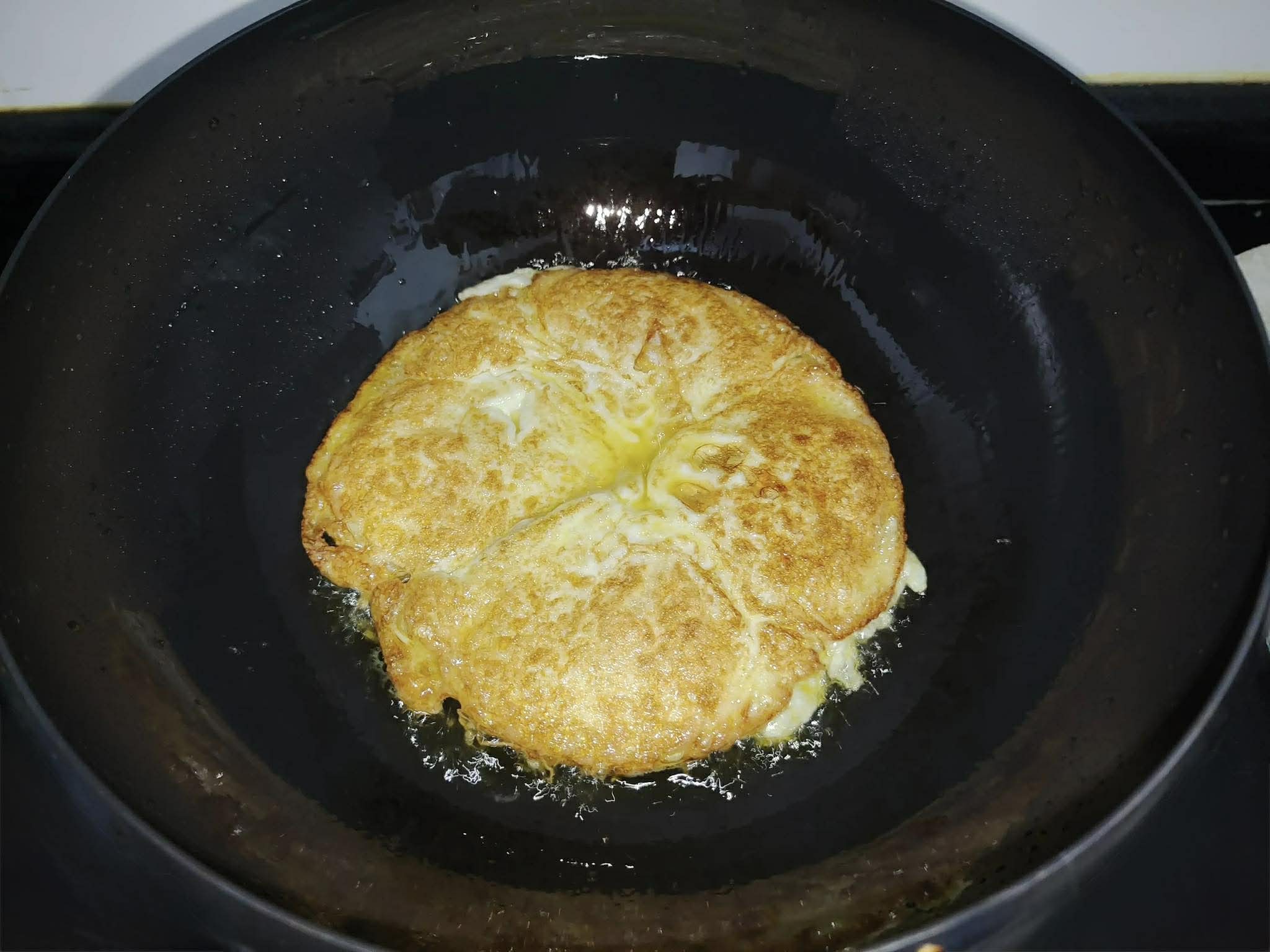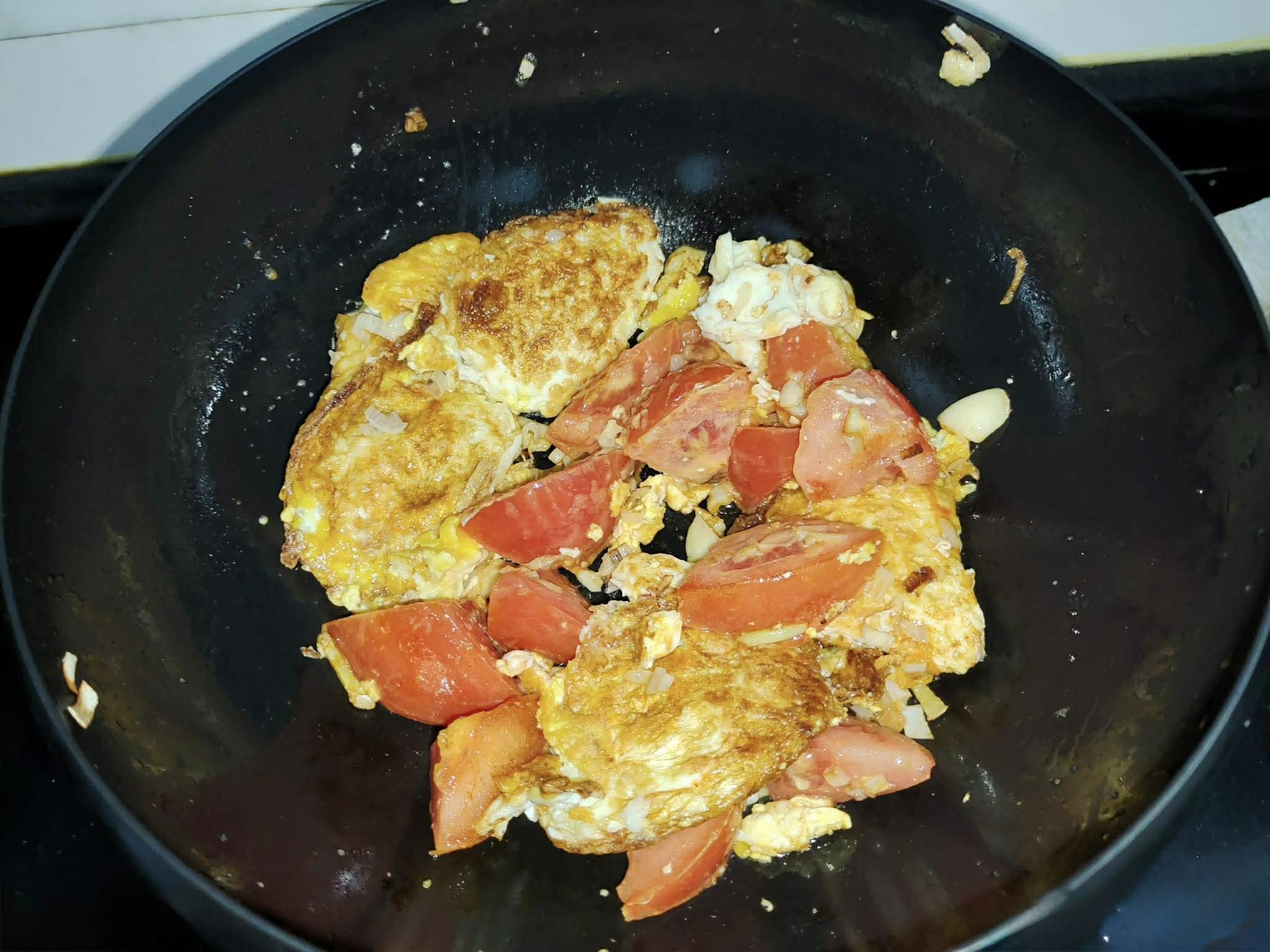 Bước 3: Đặt chảo lên bếp, đun nóng rồi cho lượng dầu ăn vừa đủ vào. Khi dầu nóng thì đập trứng vào chiên và bắt đầu chiên. Khi mặt bên dưới của trứng đã chuyển màu vàng nâu, lật mặt trứng còn lại và tiếp tục chiên đến khi chín. Sau đó, dùng thìa cắt trứng thành từng miếng lớn. Đồng thời, thêm một ít gốc hành lá, gừng và tỏi vào xào cho đến khi dậy mùi thơm. Sau đó, cho cà chua thái miếng vào và xào đều. Cuối cùng, thêm một chút nước tương và xào cho đến khi hòa quyện.