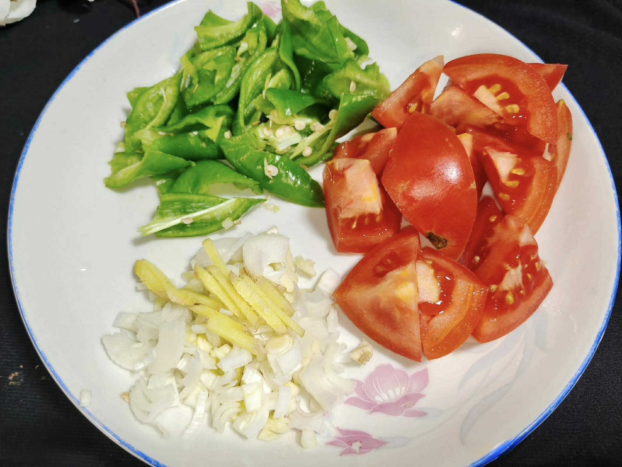 Bước 2: Cà chua rửa sạch rồi cắt thành từng miếng nhỏ. Cho cà chua vào món canh vừa để tạo màu sắc lại giúp tăng hương vị ngon hơn. Tiếp đó cắt bỏ cuống và hạt ớt chuông sau đó rửa sạch, thái miếng vừa ăn. Gốc hành lá bạn đem rửa sạch rồi thái nhỏ. Gừng rửa sạch đem thái sợi hoặc băm nhỏ. Tỏi đập dập băm nhỏ.