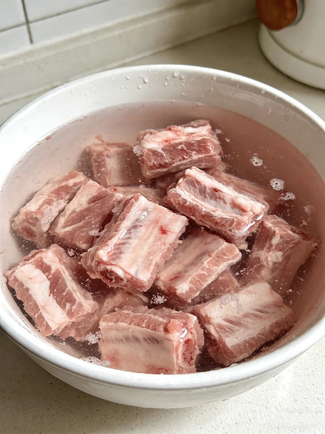 Bước đầu tiên và cũng quan trọng nhất là xử lý sườn cho sạch và không bị tanh. Bạn có thể ngâm sườn trong nước sạch khoảng 10 phút để máu tanh ra bớt. Sau đó, cho thêm chút bột năng vào bóp nhẹ vài lần, rồi rửa sạch lại dưới vòi nước. Làm vậy sườn sẽ trắng hơn, khi chín không bị mùi hôi. Vớt ra để ráo nước hoàn toàn.