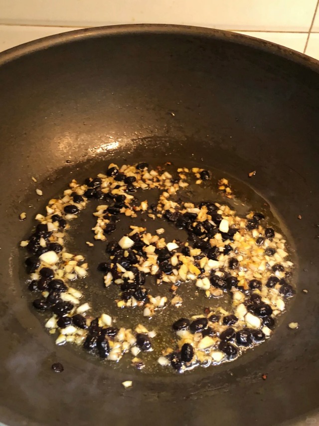 Tiếp theo, chuẩn bị phần đậu đen lên men. Đậu đen lên men mua về rửa nhẹ, để ráo rồi băm nhỏ. Cho tỏi băm và đậu đen lên men vào một cái chén nhỏ, đổ ít dầu nóng vào để kích thơm, bước này làm món ăn thơm nức mũi ngay từ đầu. Mùi tỏi và đậu đen lên men hòa quyện với nhau, chỉ ngửi thôi đã thấy thèm.