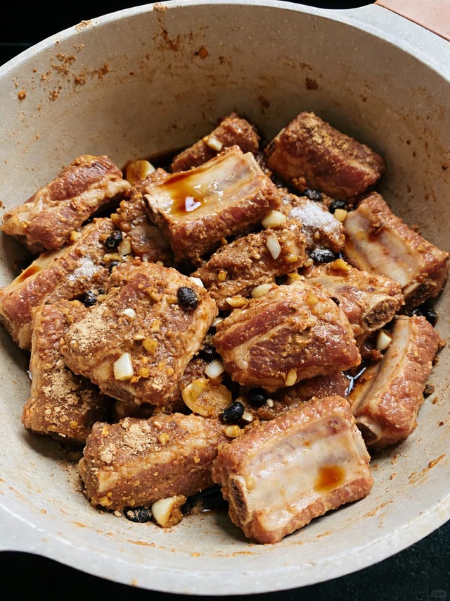 Bây giờ đến phần ướp sườn. Cho vào tô sườn tất cả gia vị: Nước tương, dầu hào, rượu nấu, đường, muối, phần tỏi đậu đen lên men đã phi thơm, và bột năng. Dùng tay trộn đều, bóp nhẹ để gia vị thấm vào từng miếng thịt. Ướp khoảng 15-20 phút là được. Nếu có thời gian, ướp 30 phút sẽ càng ngon.