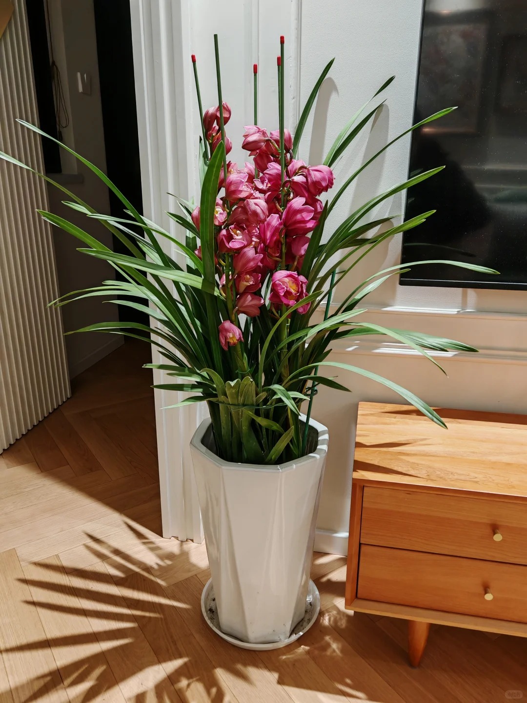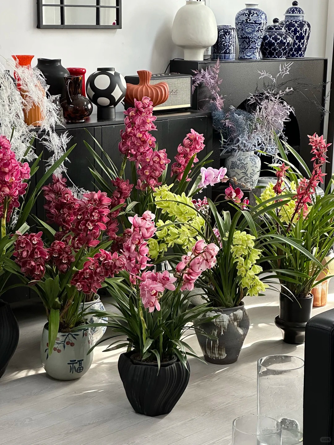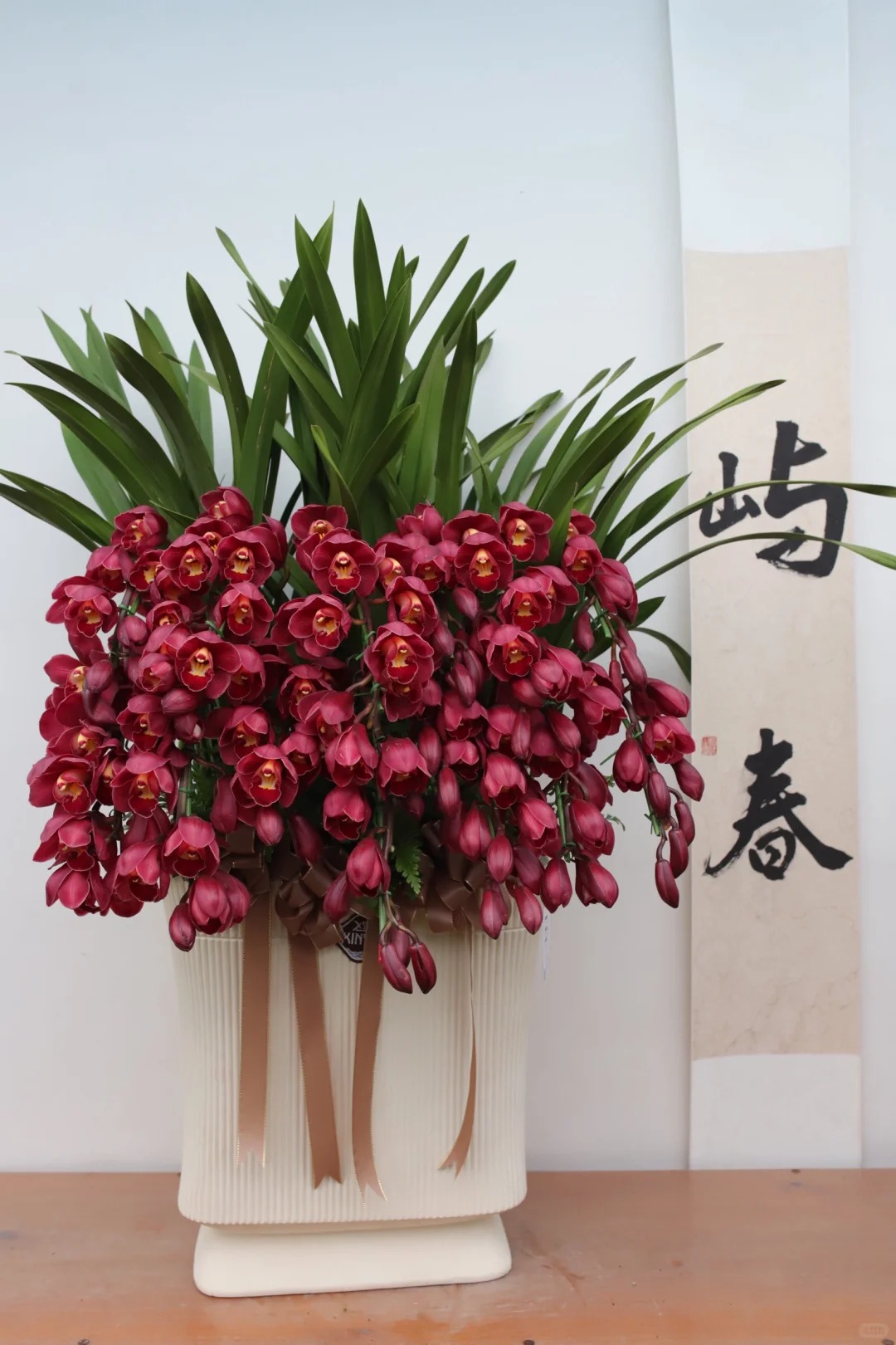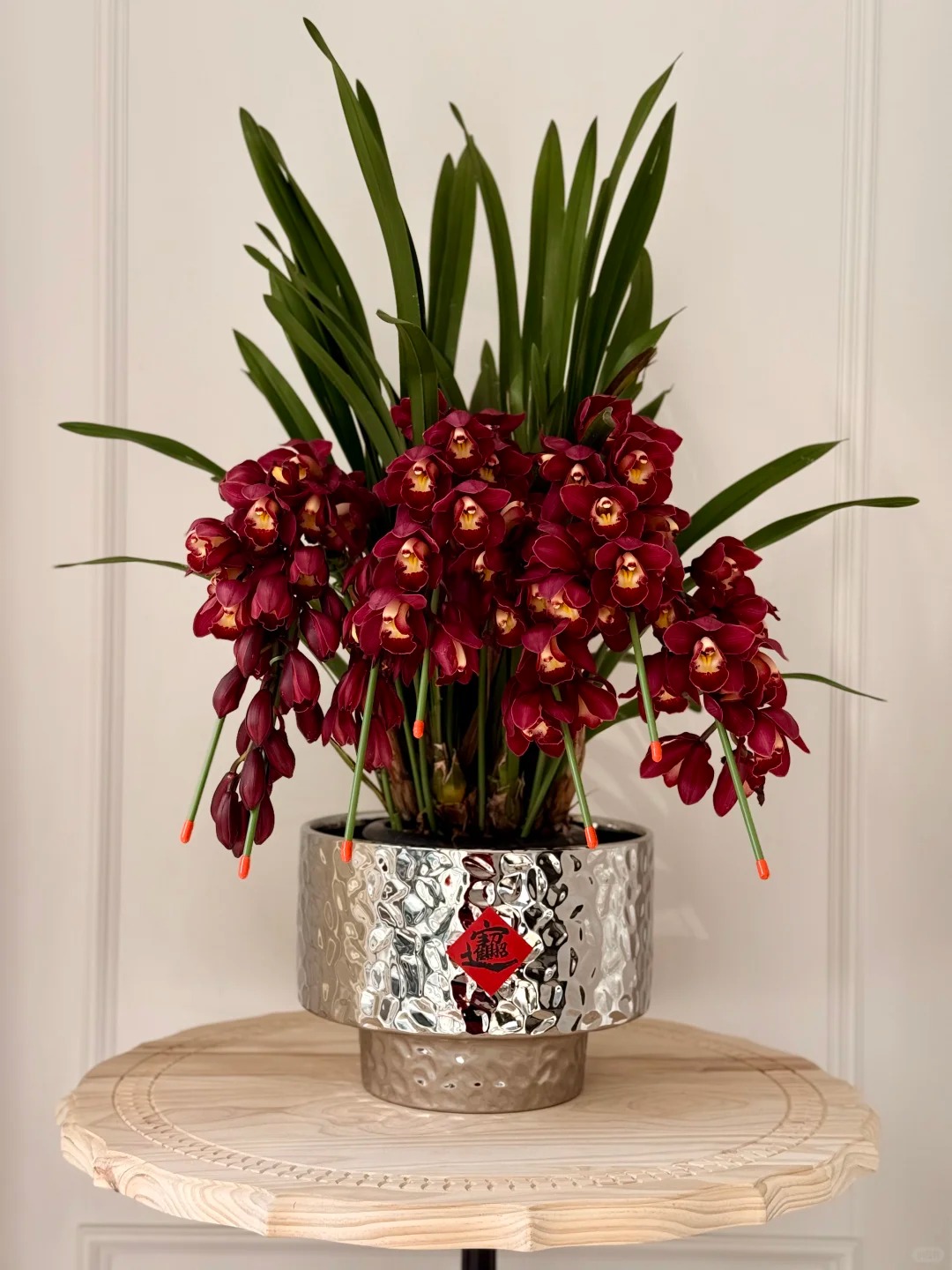Địa lan là một trong những loài lan được chuộng nhất mỗi dịp Tết Nguyên đán. Những chùm nụ cong cong như dây pháo, khi nở bung thì thành cả thác hoa, mỗi bông đều đầy đặn, sắc nét, đứng xa cũng thấy khí chất “nhà có điều kiện”.