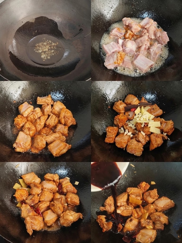 Ngay lúc này, bạn thả ngay những lát gừng tươi, khúc hành xắt sẵn và cánh hoa hồi vào chảo, xào chung đến khi mùi thơm nức mũi bốc lên ngào ngạt tản ra khắp nhà thì rưới nhẹ thêm một thìa rượu nấu ăn, xì dầu nhạt và hắc xì dầu vào. Quá trình xào lăn trên lửa sém này giúp gia vị tươm ra, quyện chặt vào bề mặt sườn, tạo nên lớp nền hương vị vô cùng đậm đà và màu sắc bắt mắt không chê vào đâu được.