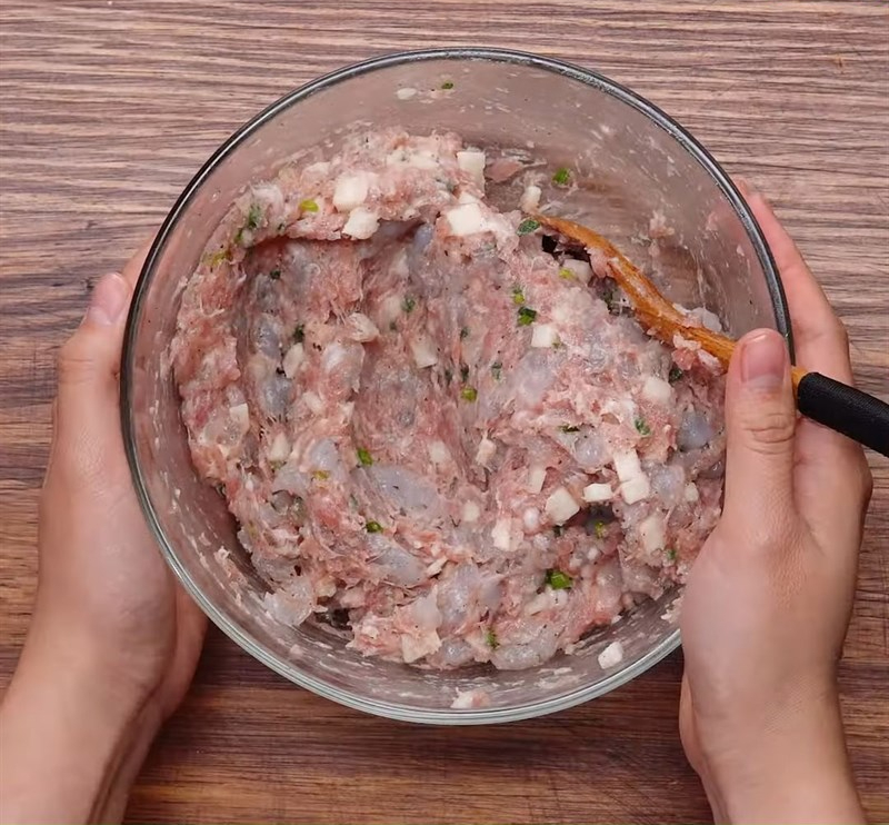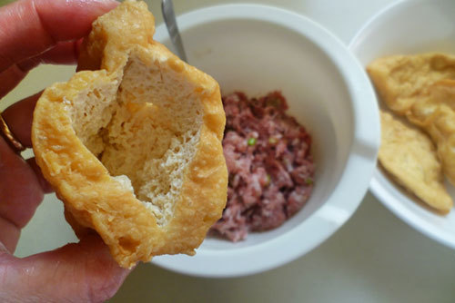 Lựa chọn nhân quyết định linh hồn của món ăn này. Phần nhân nhồi vào đậu phụ tùy thuộc vào sở thích của gia đình bạn. Bạn có thể dùng hỗn hợp thịt heo băm và tôm. Thịt heo băm (nên dùng thịt nạc vai với 30% mỡ, 70% nạc) và nêm muối, nước tương, rượu nấu ăn, tiêu trắng và một ít đường. Tôm sau khi bóc vỏ, bỏ chỉ đen thì băm nhỏ (đừng băm quá nhuyễn) để giữ lại kết cấu giòn ngọt. Trộn đều hai nguyên liệu, thêm nấm hương và hành lá thái nhỏ. Sau đó thêm một lòng trắng trứng rồi khuấy theo chiều kim đồng hồ cho đến khi hỗn hợp sệt lại. Nhân này có hương thơm nồng nàn của thịt heo, vị ngọt của tôm và hương vị độc đáo của nấm hương.