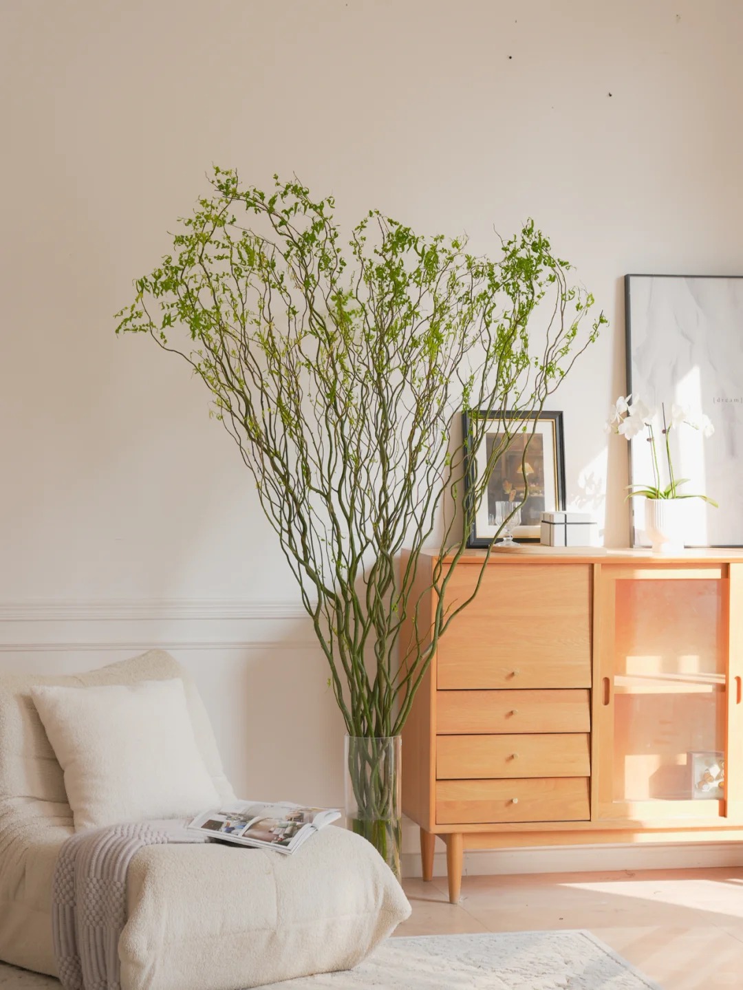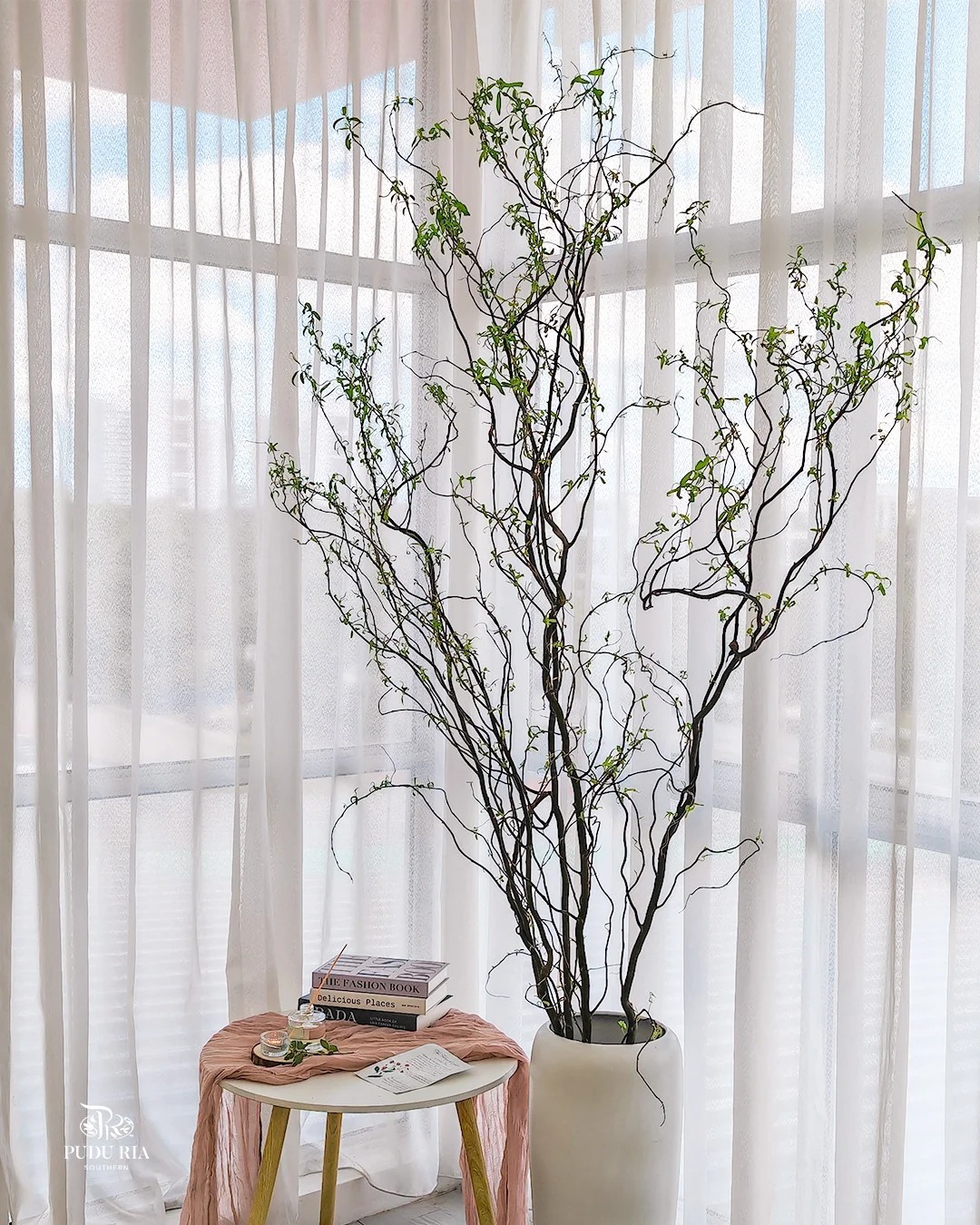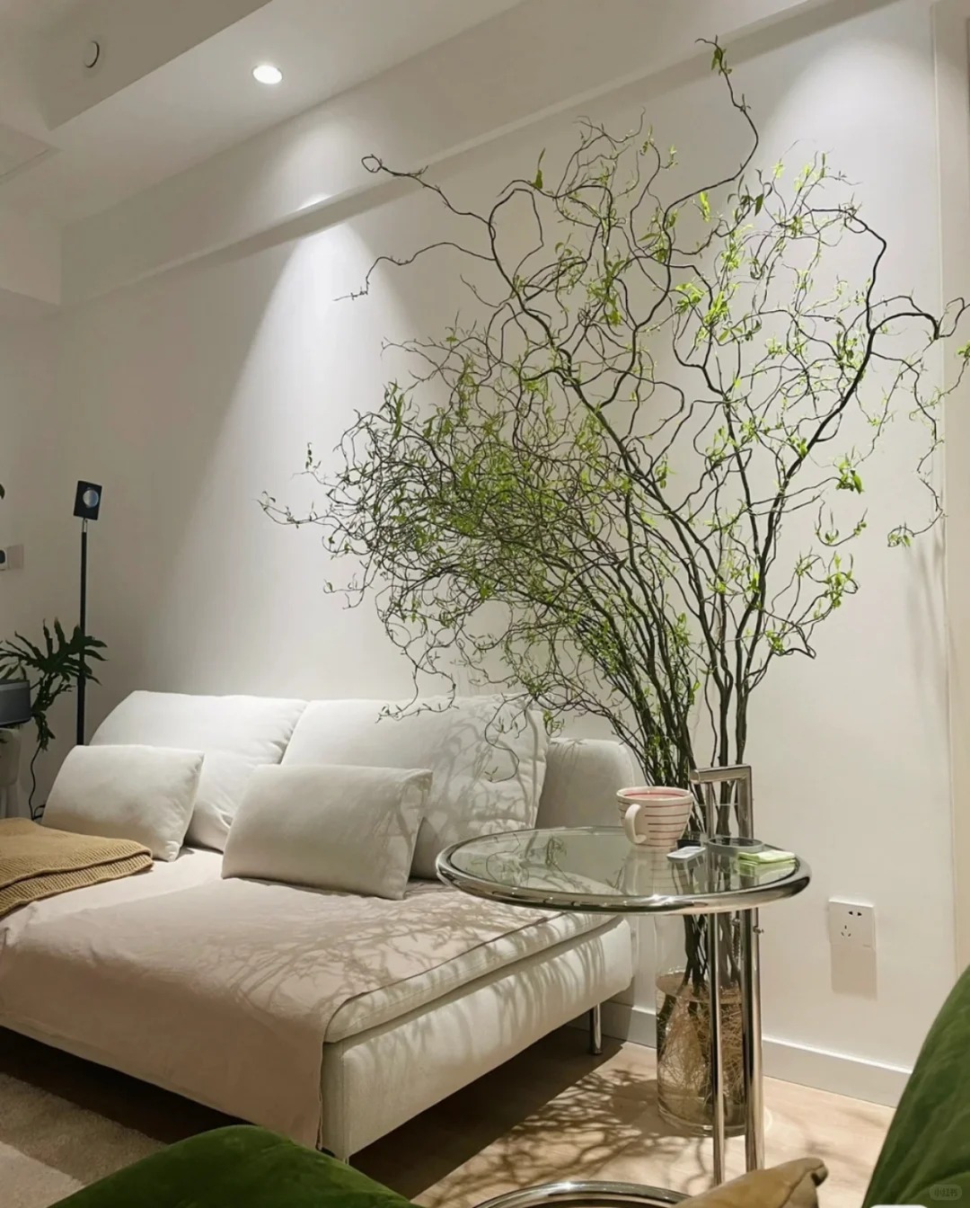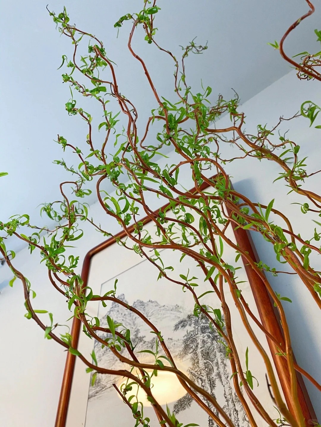 Chính nhờ dáng vẻ độc bản ấy mà Liễu Rồng trở thành "chân ái" cho những ai yêu thích phong cách tối giản (Minimalism), Wabi Sabi hay phong cách Á Đông (Indochine). Bạn chẳng cần phải là một nghệ nhân cắm hoa tài ba, chỉ cần thả vài cành Liễu vào một chiếc bình gốm mộc hay bình thủy tinh trơn, đặt ở góc phòng khách, bàn trà hay kệ sách, không gian lập tức trở nên có chiều sâu và "nghệ" hơn hẳn. Những đường cong của Liễu Rồng như phá vỡ sự cứng nhắc của những bức tường, những món đồ nội thất vuông vức, mang lại cảm giác mềm mại và thư thái cho gia chủ.