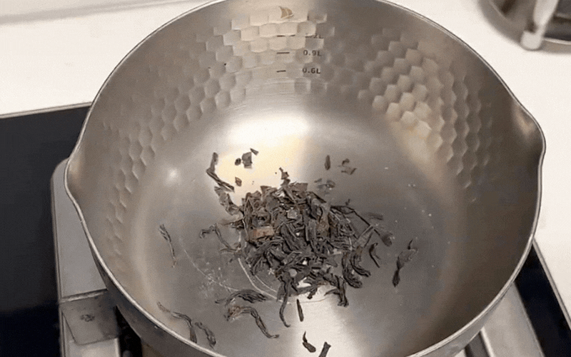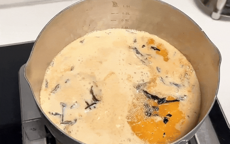 Trong một chiếc nồi nhỏ, cho một muỗng trà đen và đun lửa thật nhỏ để trà kịp tỏa hương. Khi mùi trà bắt đầu lan nhẹ trong bếp, thêm một muỗng đường trắng, đảo đều tay cho đến khi đường tan chảy, chuyển màu vàng nâu và bắt đầu sủi bong bóng nhẹ như caramel. Khoảnh khắc này rất “đã” - mùi trà quyện cùng mùi đường thắng thơm đến mức chỉ đứng bếp thôi cũng thấy đáng công.
