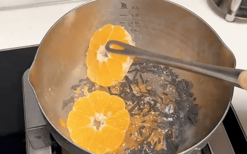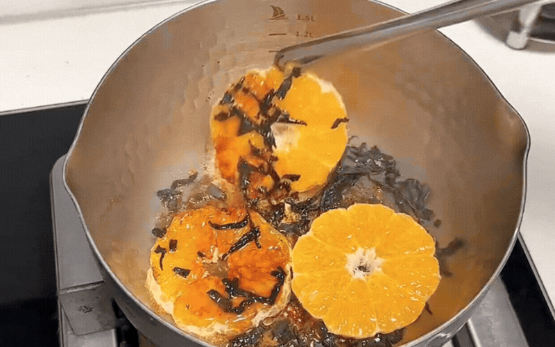 Sau khi phần đường chuyển màu đẹp mắt, cho những miếng cam đã chuẩn bị vào nồi. Áp chảo mỗi mặt khoảng một phút, lật nhẹ tay để cam không vỡ. Bạn sẽ thấy múi cam óng lên, phần mặt tiếp xúc với nồi hơi xém nhẹ, dậy mùi thơm rất rõ.